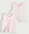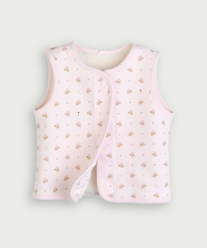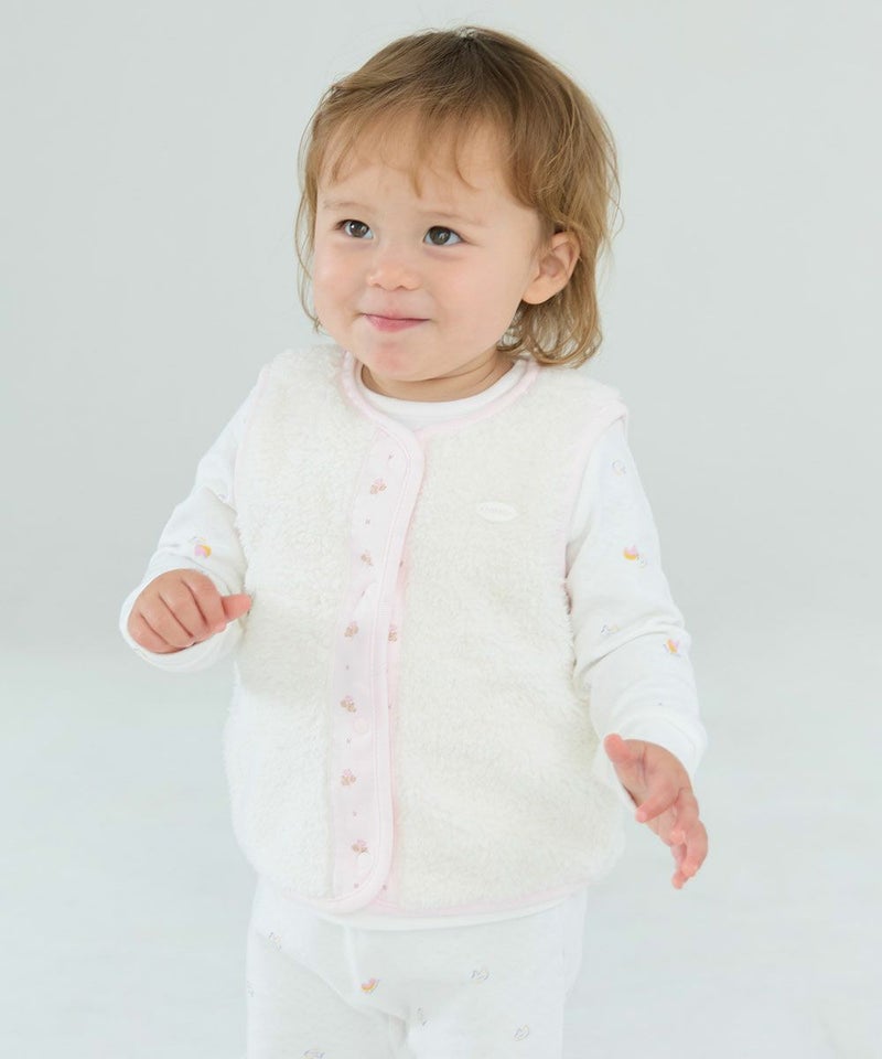 うれしいリバーシブルタイプのルームベスト。色によってネコのミャオ(meow)やCuteなフラワーの総柄タイプと、モコモコで柔らかく肌ざわりのよいフェイクファーにパイピングにコットン側の生地が配色されタイプがあり、胸元にはブランドごろのプレートがさりげなく付いたタイプ。コットン素材の商品は、着心地・肌へのやさしさ・快適性に優れた、毎日着たくなる安心素材です。スナップボタンなので全開きとなり脱着も簡単です。