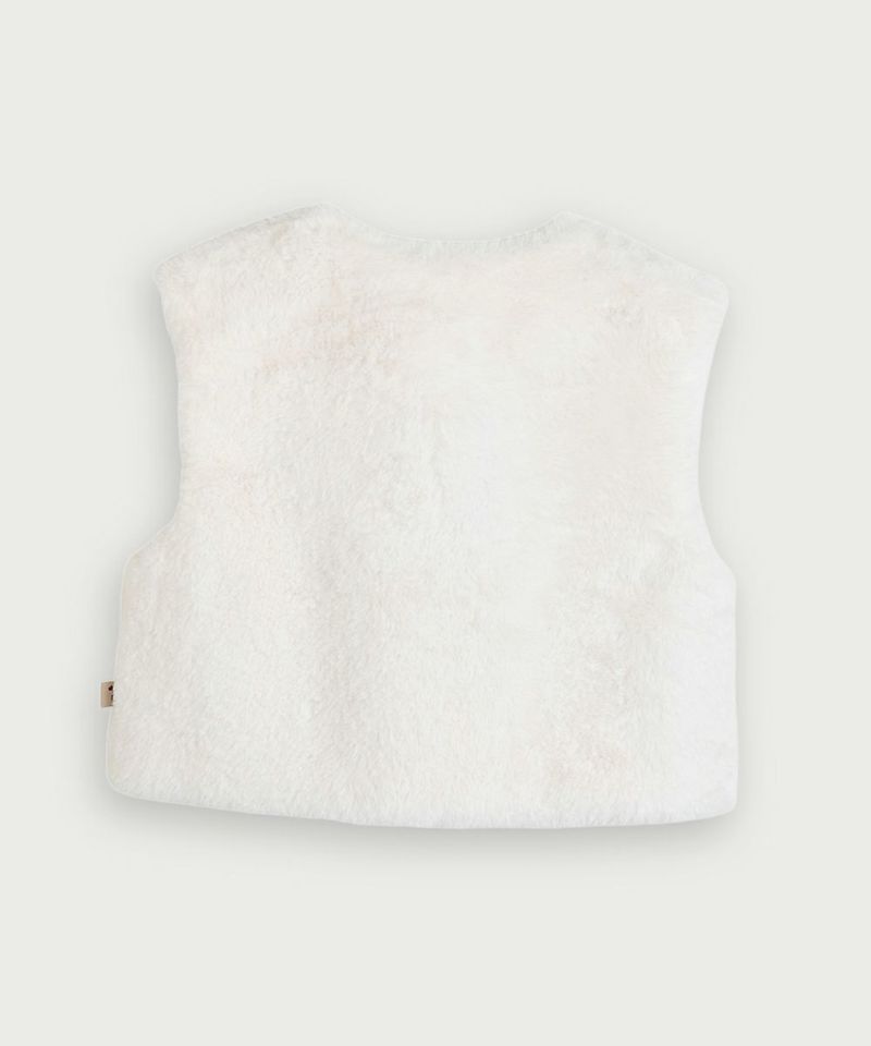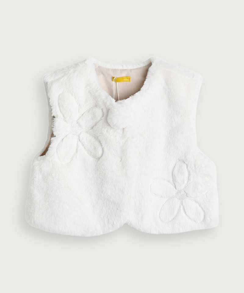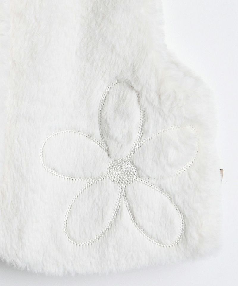 花のモチーフがかわいいフェイクファーベスト。ビッグフラワーチェーン刺繍とポンポンで愛らしさをプラス、女性の子らしいルックにぴったりなアイテムは、ワンピースなどとのレイヤーもおすすめです。