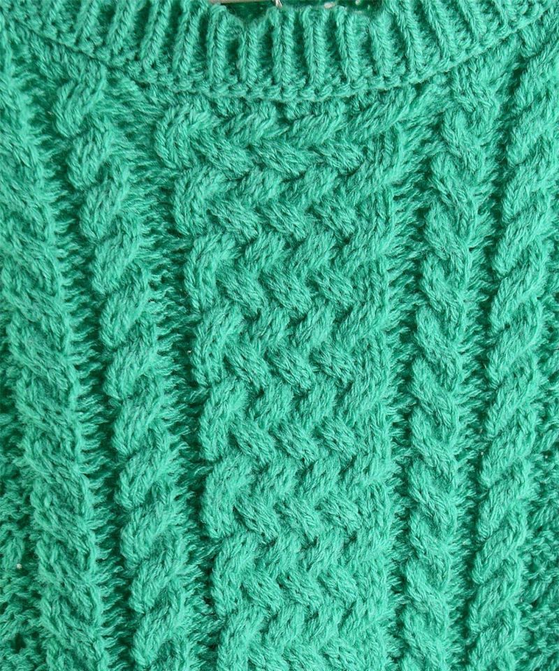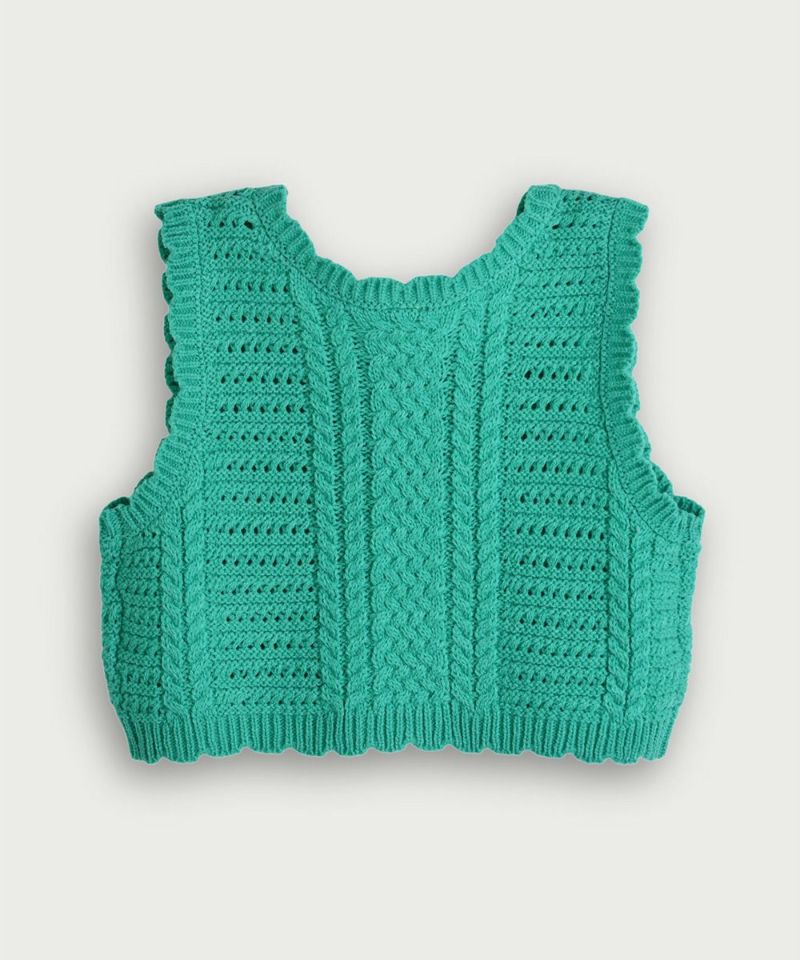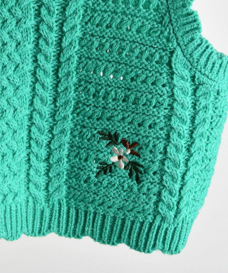ブルーグリーンのショート丈のビュスチェ風ニットベスト。高級感のあるケーブル編みにフラワーの刺繍でほのかなポイントを加えたデザイン。ブラウスやワンピースの上に暖かくレイヤードしやすい冬のデイリールックのアイテムとしてぴったりの商品です。