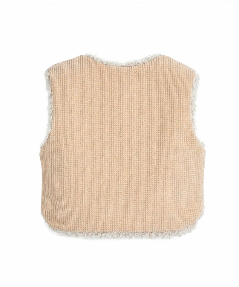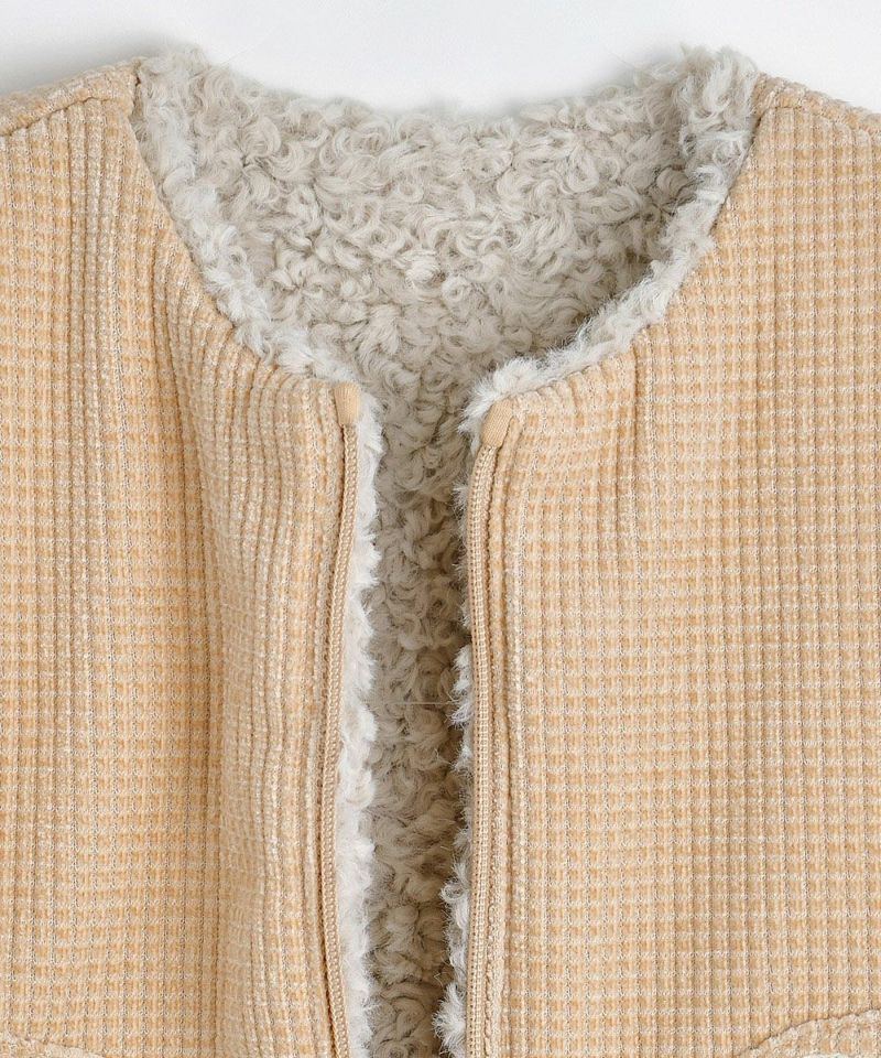 柔らかい起毛素材とふわふわのファーで構成されたリバーシブルベスト。アウトポケットの花刺繍がポイントで、ラブリーにスタイリングしやすく、ほのかなライトグレートーンの面はおしゃれで雰囲気のあるコーデが演出ができ、保温性と実用性の両方で優れたアイテムです。