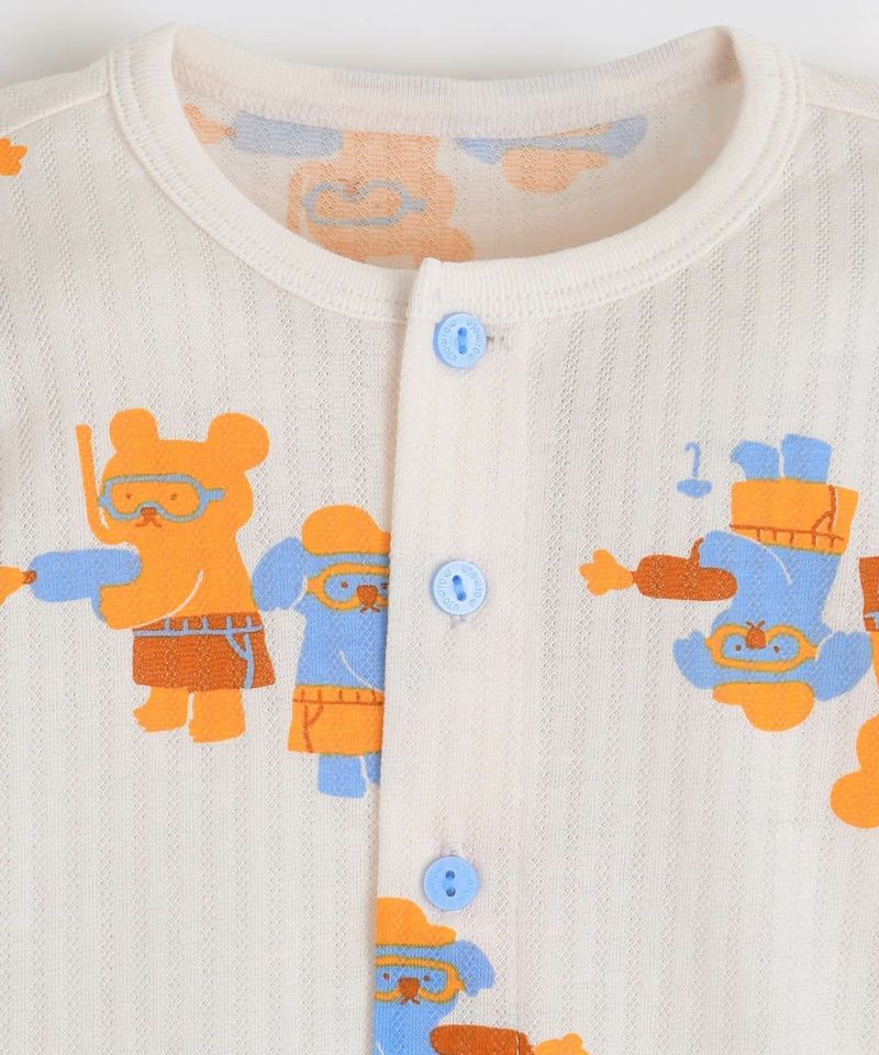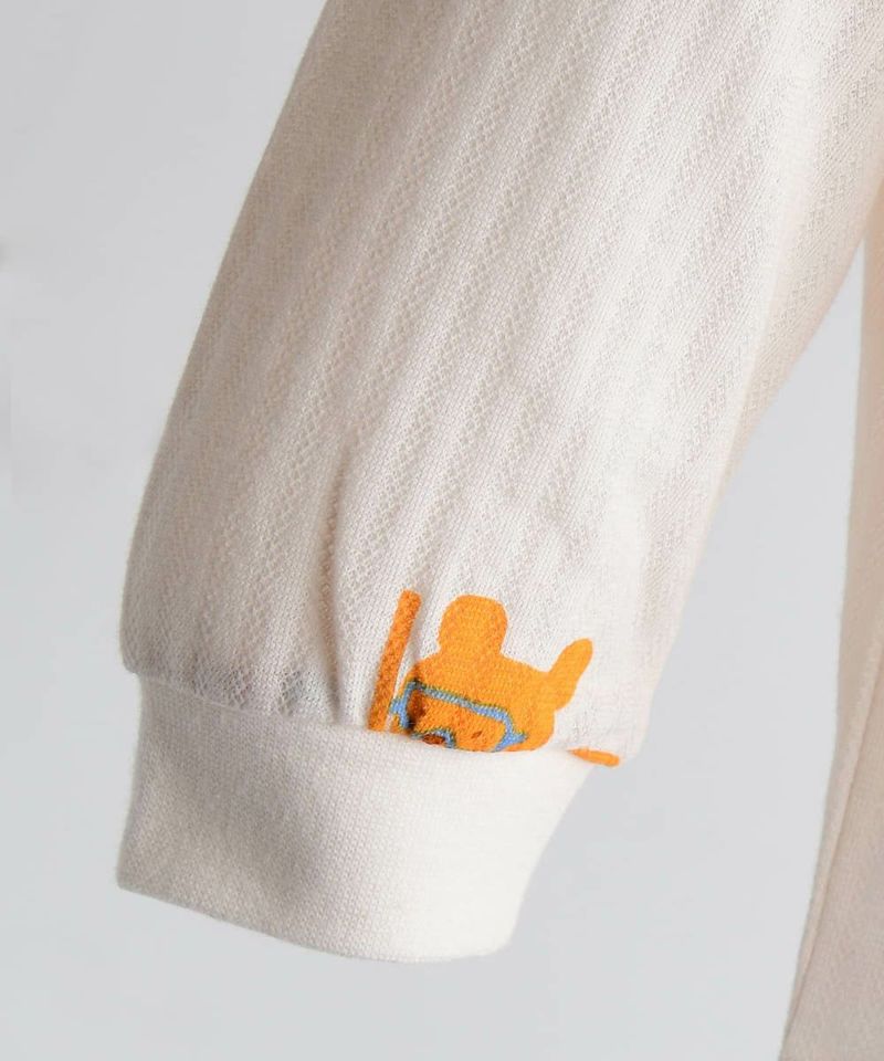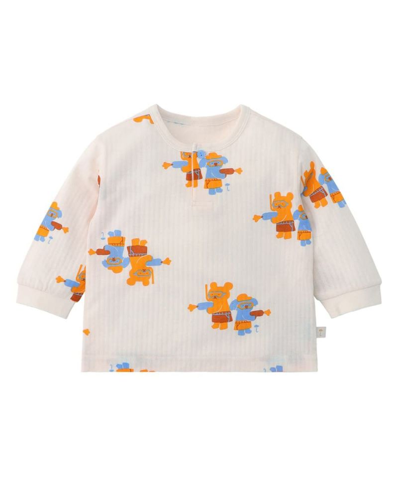 清涼感のある素材を使用したルームウェア。水鉄砲で遊ぶアニマルモチーフが夏らしい仕上がり。ルーズシルエットがラフな印象で、ワンマイルウェアとしても着用できるアイテムです。
