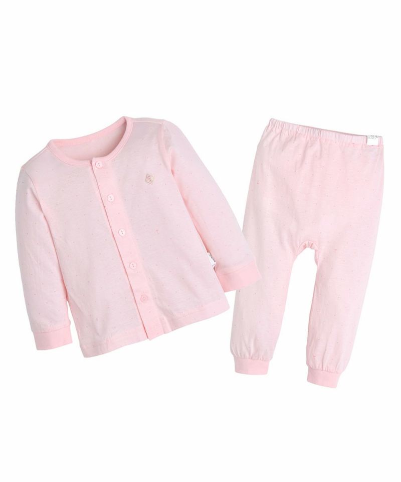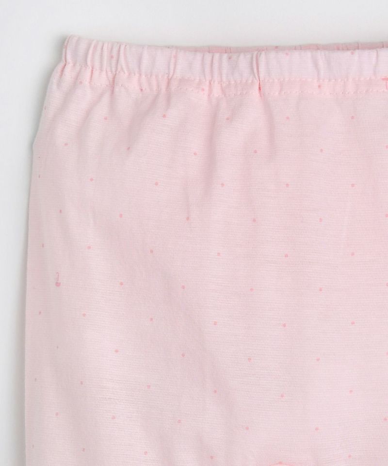 コットン100%の長袖パジャマ。ピンクカラーの生地に細やかなドット柄、胸元にはモイモルンの雲マークの刺繍付き。ベビーギフトとしてもおすすめです。