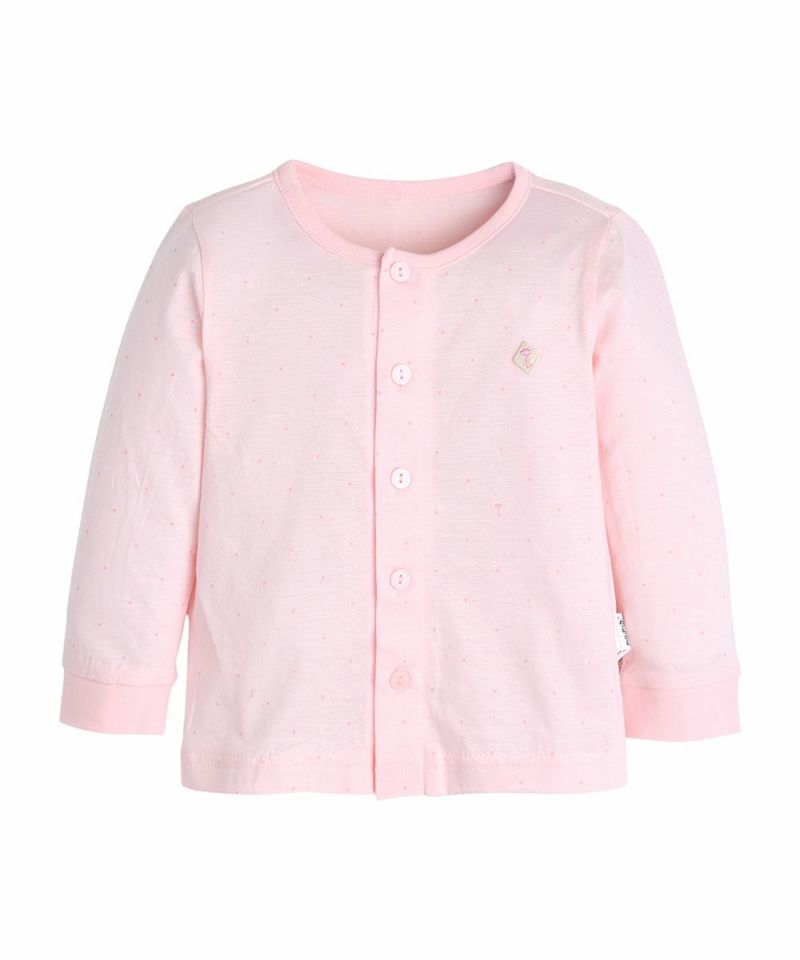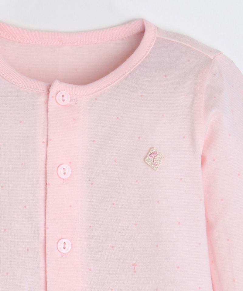 コットン100%の長袖パジャマ。ピンクカラーの生地に細やかなドット柄、胸元にはモイモルンの雲マークの刺繍付き。ベビーギフトとしてもおすすめです。