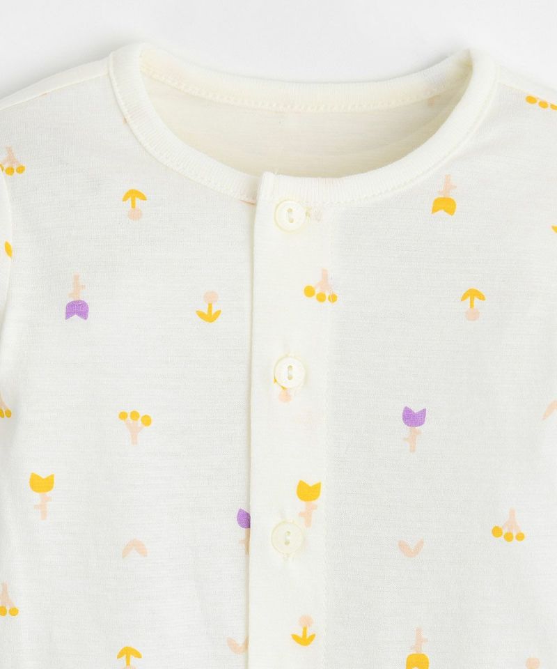 コットン100%の長袖パジャマ。優しいイエローカラにチューリップなどの小花をちりばめています。ベビーギフトとしてもおすすめです。