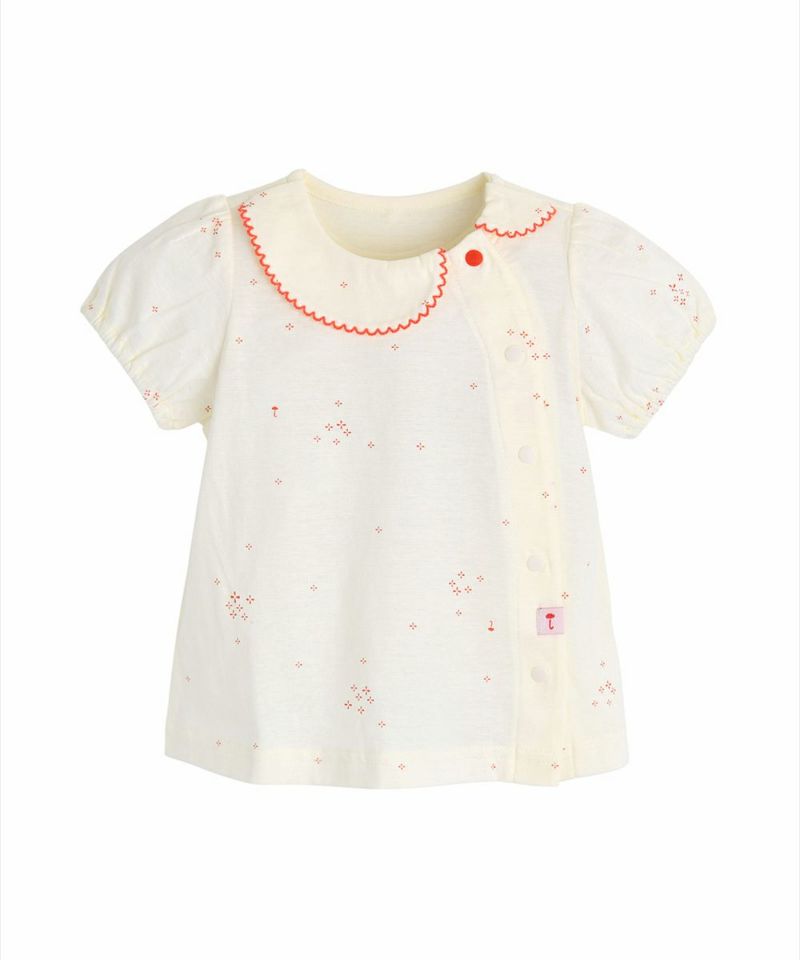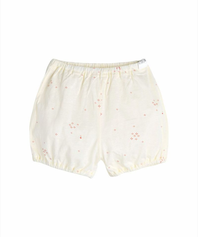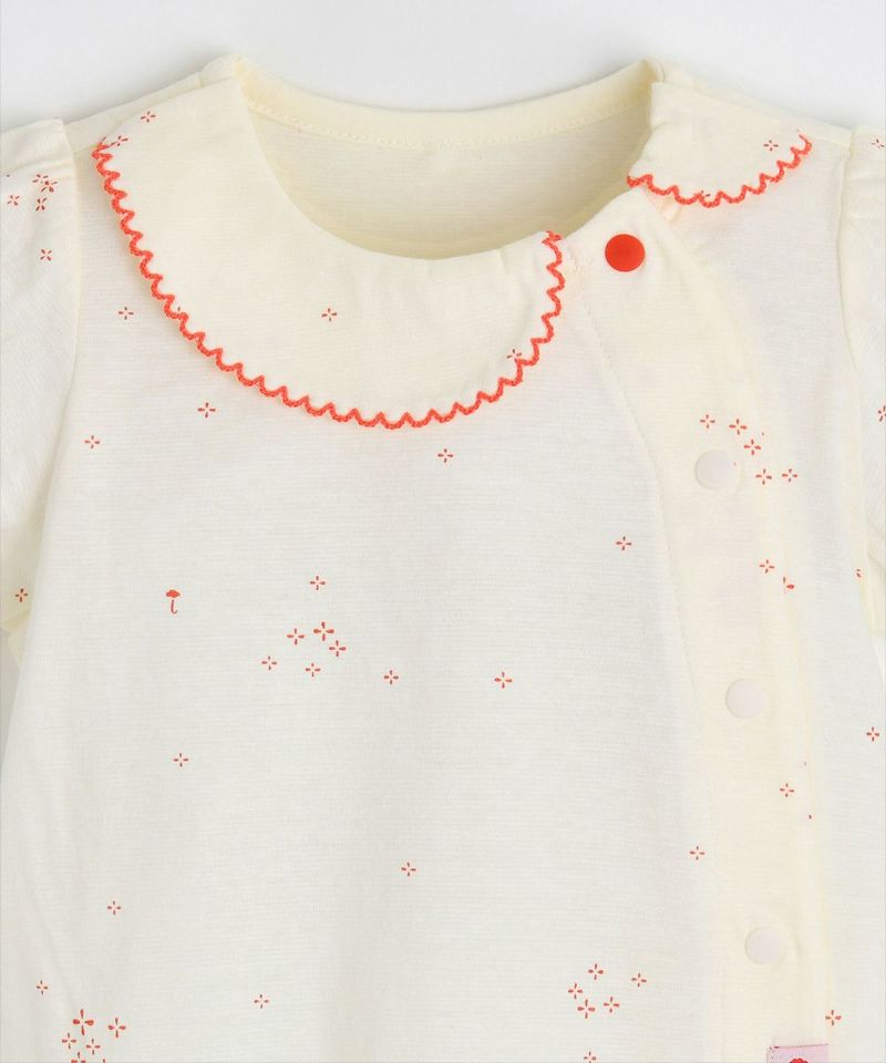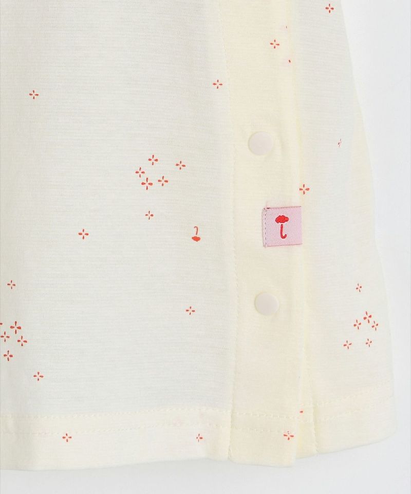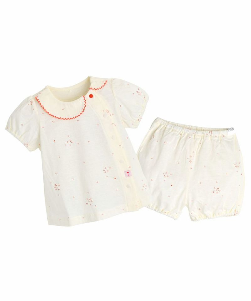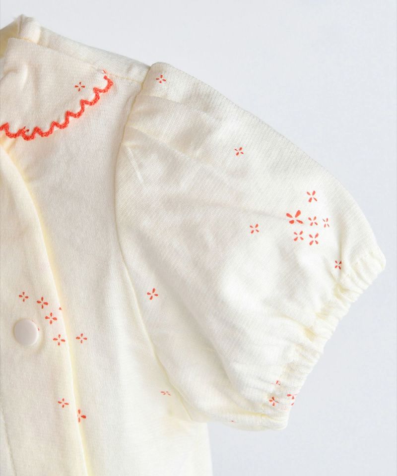 コットンの半袖ルームウェア。クリームカラーにカラー刺繍の襟パイピング、全体に広がるユニークな花柄がアクセントになっています。ブルマ風のショートパンツもとってもCute。ベビーギフトとしてもおすすめです。