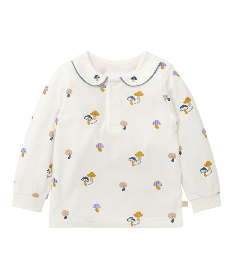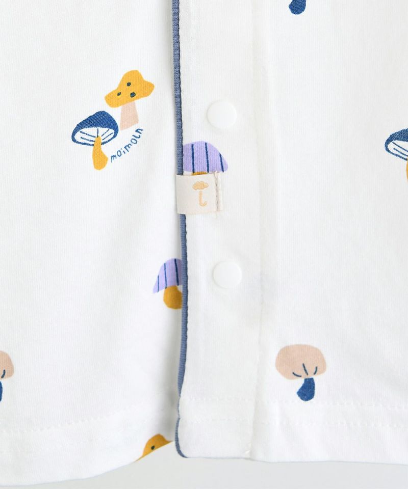 キノコの総柄の襟付き長袖トップスとロングパンツのルームウェア。襟のキノコ刺繍、パイピング配色がポイント。スナップボタンで脱着も簡単、袖口と裾はリブ仕様となります。バンブーレーヨンとコットンを組み合わせており、肌触りもとてもやわらかく、動きやすいためギフトにもおすすめのアイテムです。サイズによってフロントのボタン配置位置のデザインが異なります。