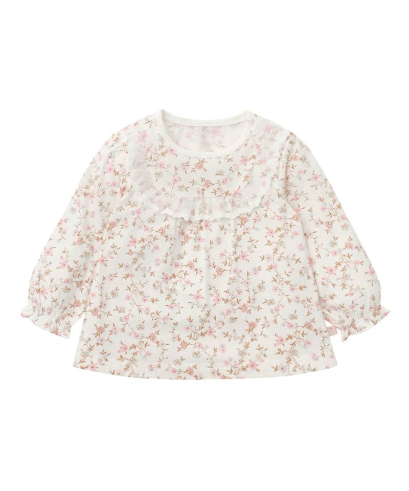 クラシカルな花の総柄の長袖トップスとロングパンツのルームウェア。トップスはAラインのシルエットにフロントのレースフリル使いがアクセントに。スナップボタンで脱着も簡単、袖口と裾はゴム入りでフリルのような仕上がりでとってもCute.サイズによってスナップボタン位置のデザインが異なります。