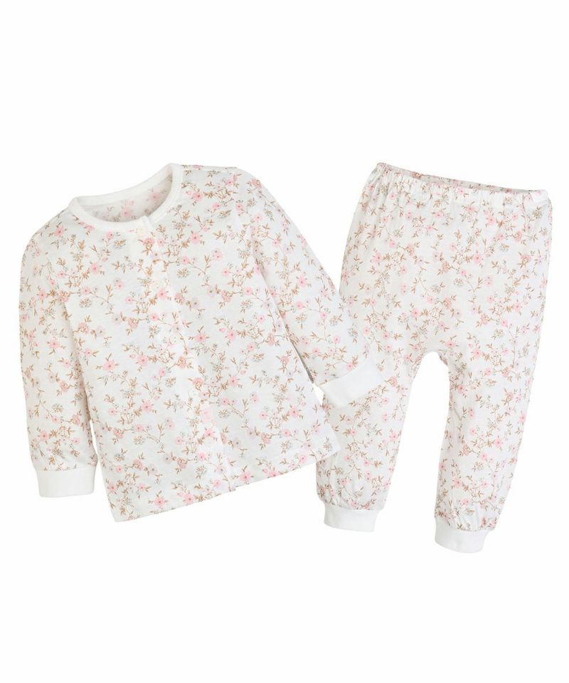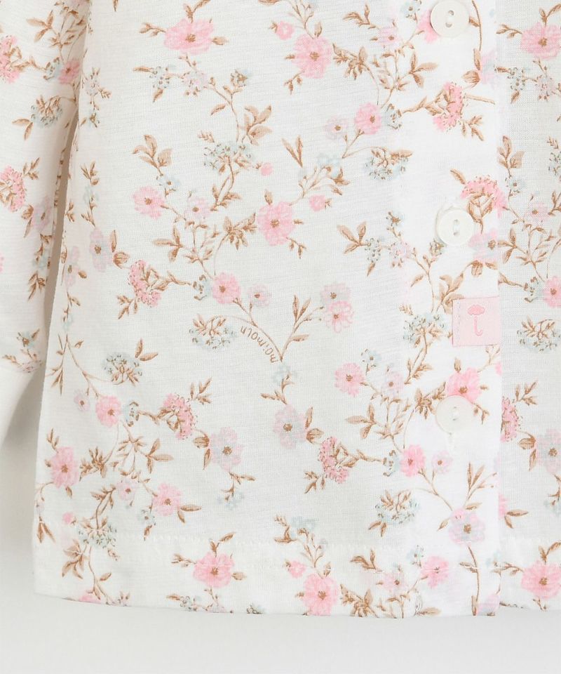 クラシカルな花の総柄の長袖トップスとロングパンツのルームウェア。シンプルなデザインで首元や袖口、裾がホワイトで統一され、すっきりした印象に。糸付きボタンで脱着しやすいアイテムです。サイズによってボタン位置のデザインが異なります。