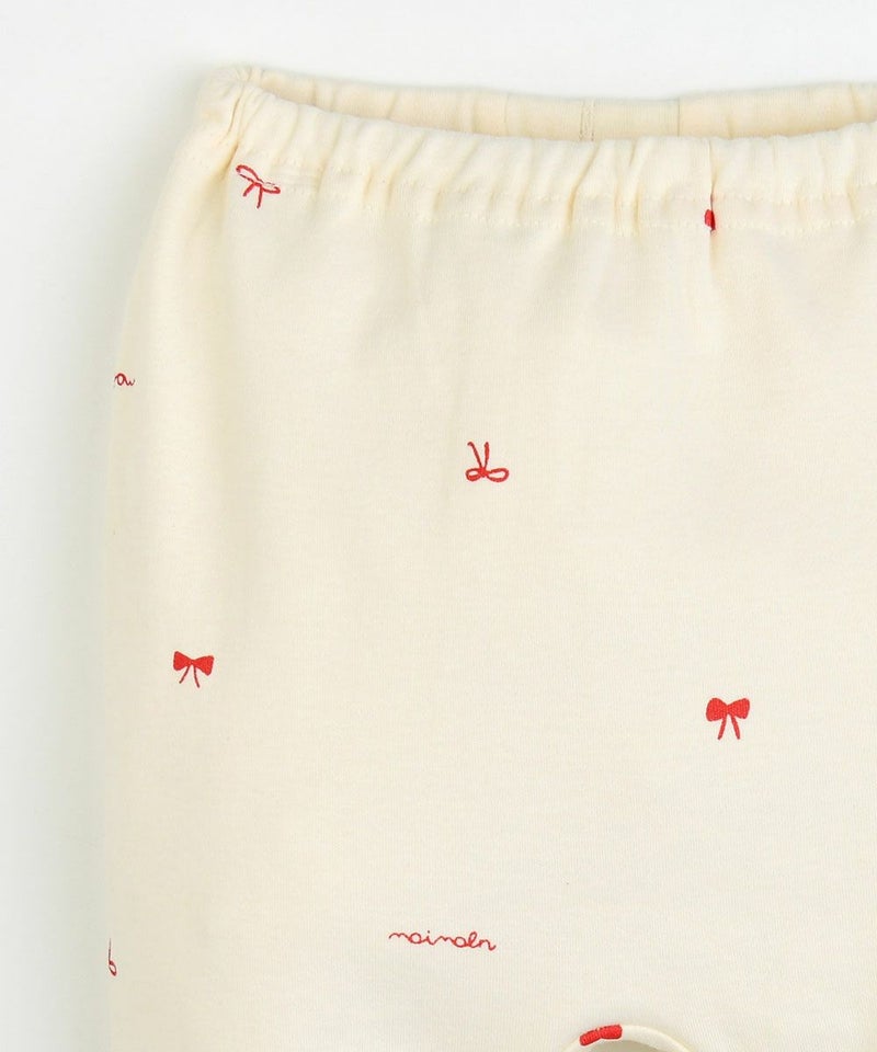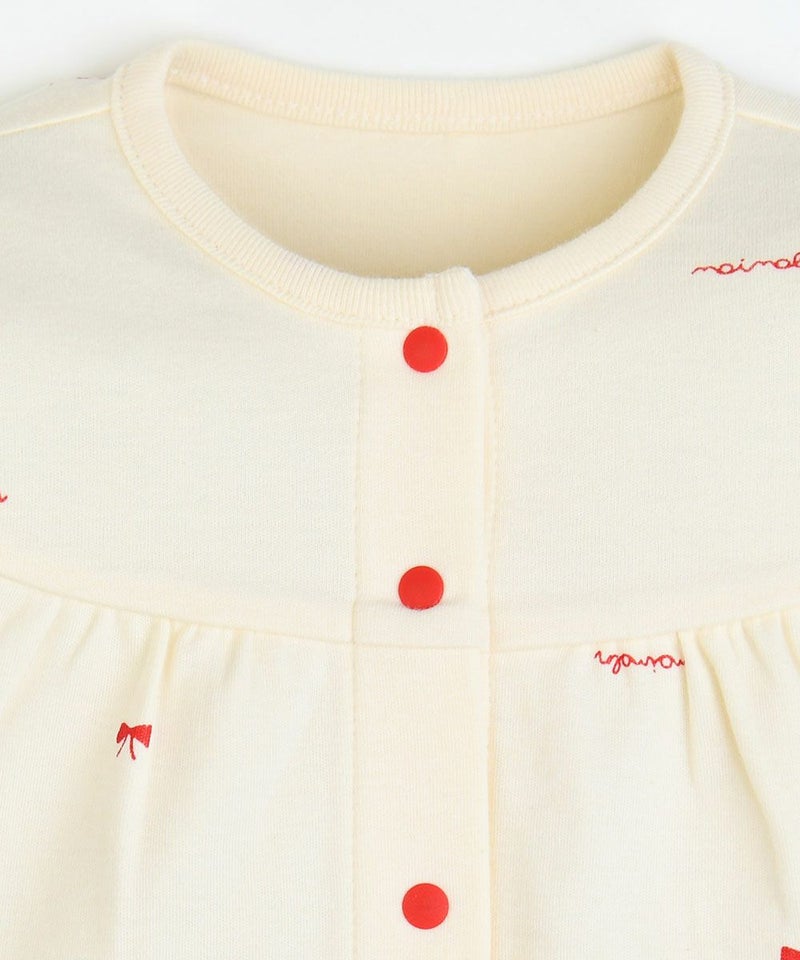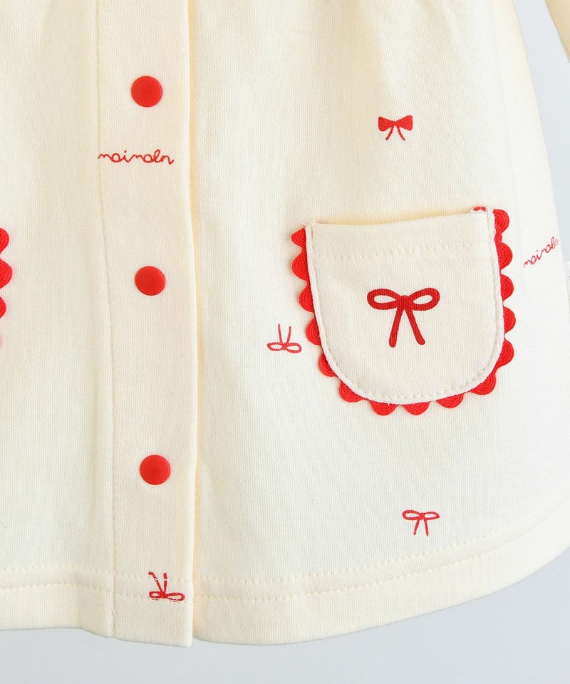 リボン柄がCuteな長袖トップスとロングパンツのルームウェア。フロントにはリボンデザイン付きのミニポケットや、レッドのパイピングが更にアクセントになったデザイン、スナップボタンで脱着もスムーズ。コットン素材の商品は、着心地・肌へのやさしさ・快適性に優れた、毎日着たくなる安心素材です。お子さまのルームウェアとしてはもちろん、ギフトにもおすすめの商品です。