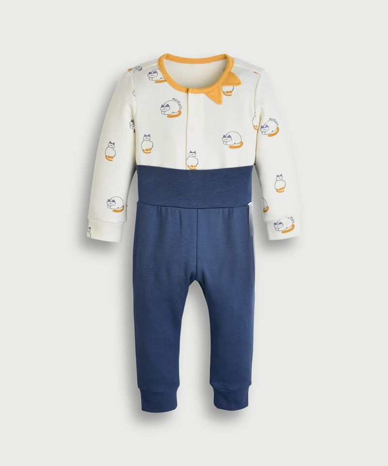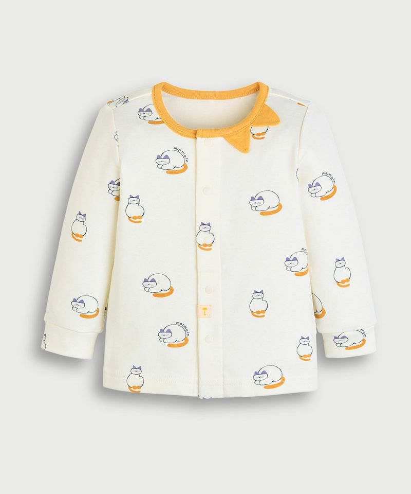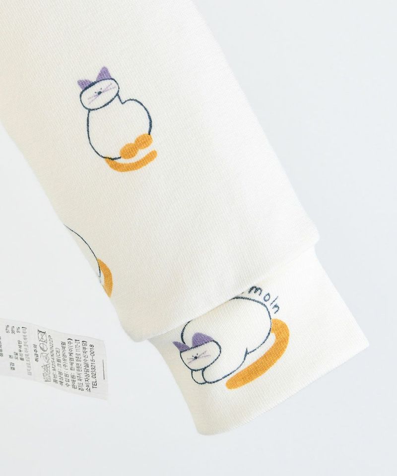 汗をかいてもベタつきにくく、一日中さらっと快適なモダールコットンを使用した長袖トップスとロングパンツのルームウェア。全体的にかわいいネコのミャオ(meow)がプリントが施され、襟元にはネコの耳のアクセント、お子さまの愛らしさを引き立ててくれます。スナップボタン付きで、脱着もスムーズ。寝てる間も安心な腹巻タイプのパンツとのセットなので、お子さまの快適な眠りをサポートします。