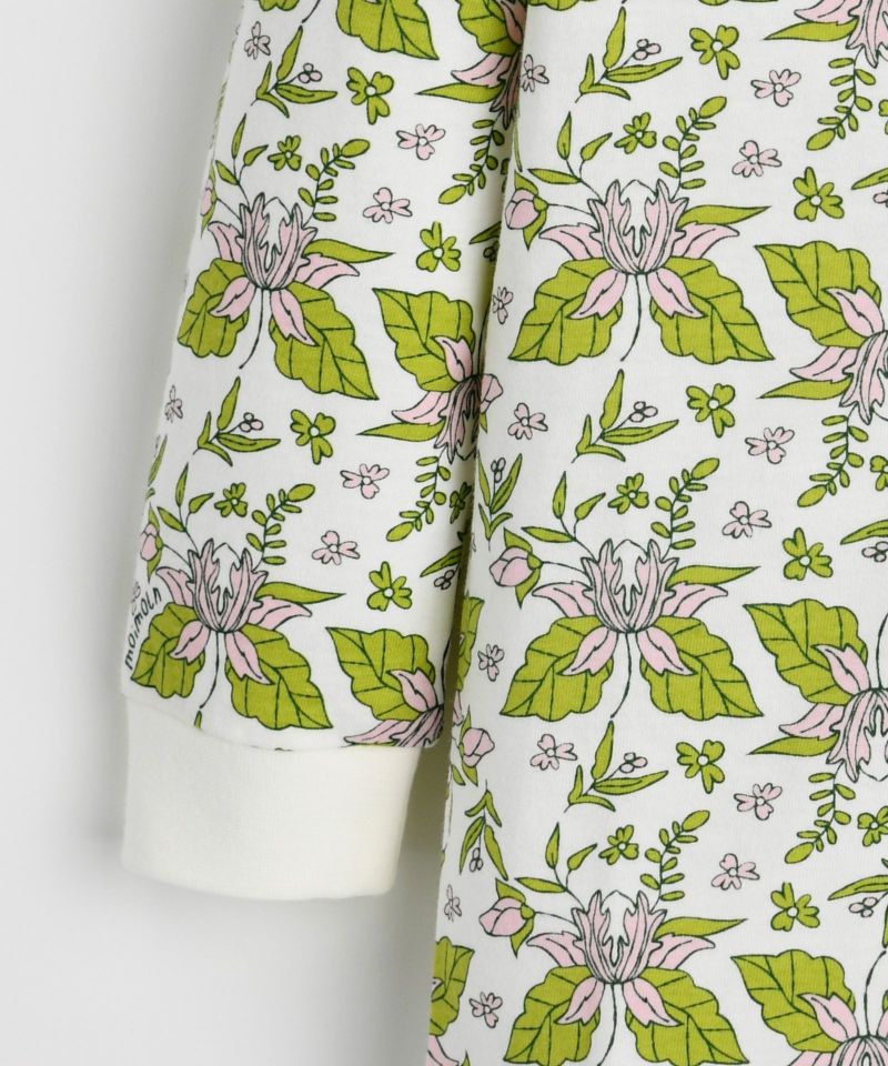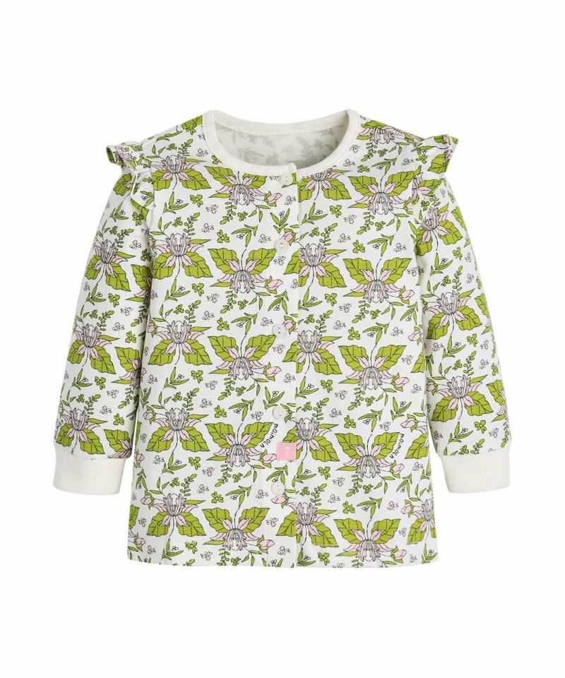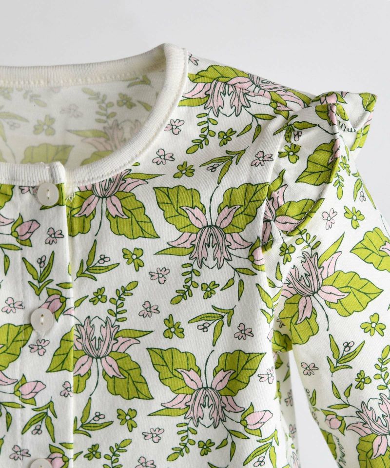雰囲気のある花柄に、肩のフリルを組み合わせた可愛いルームウェアです。