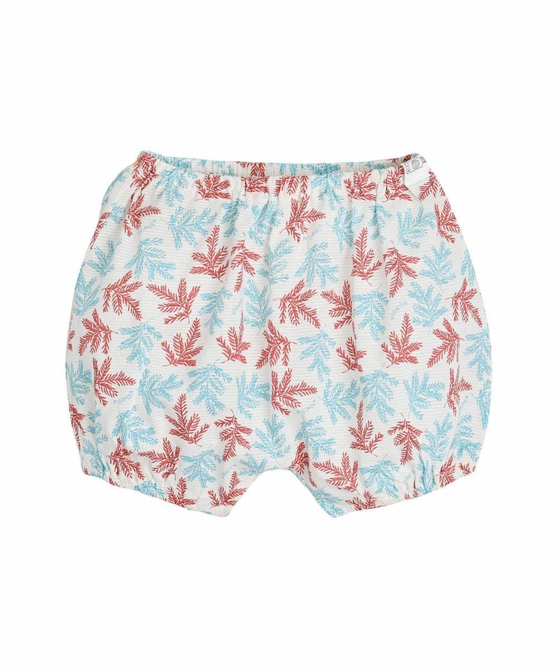 トロピカルムードのリーフ柄とスクエアゴム仕様のネックライン、袖先のバーガンディーカラーがポイントの半袖ルームウェア。シダーリーフロンパース(W242BUN20P),シダーリーフ前ボタントップス&パンツ(W242NNN47P)と兄妹ルックがおすすめです。