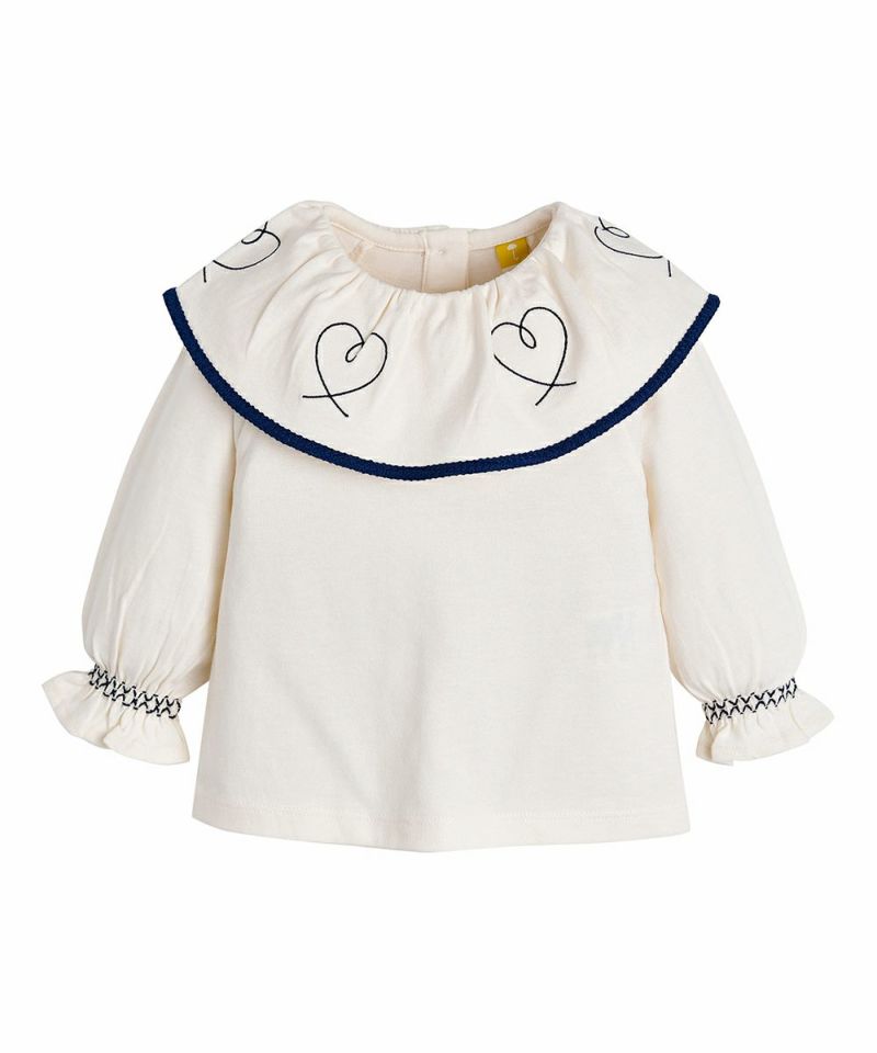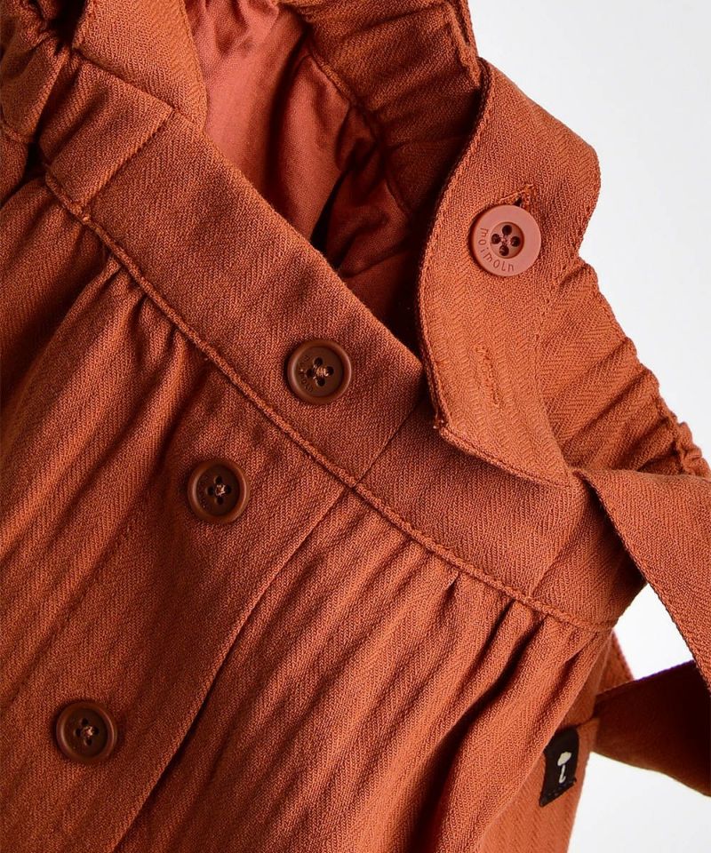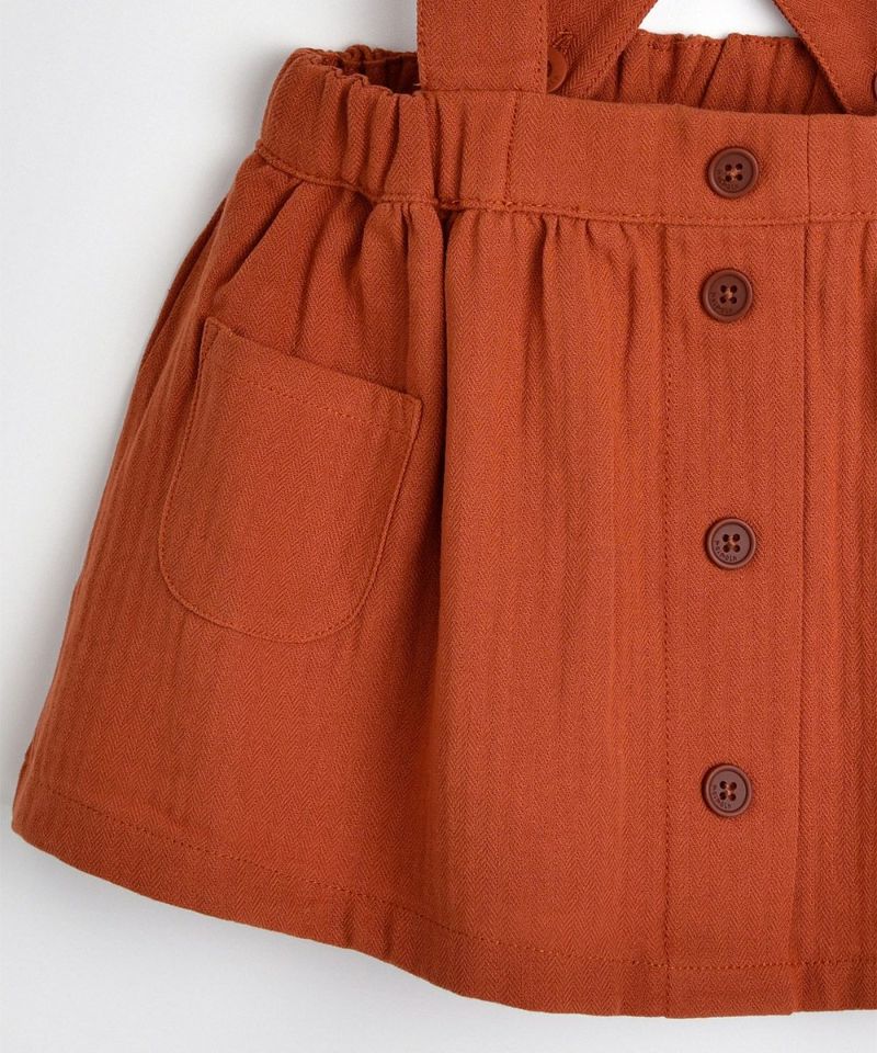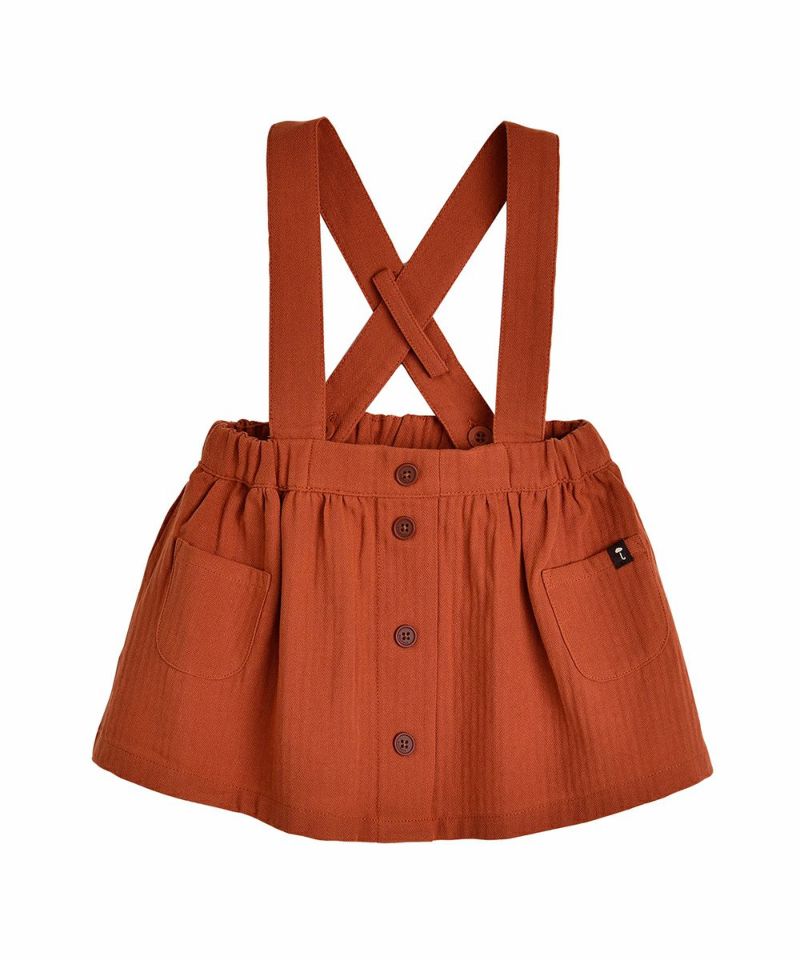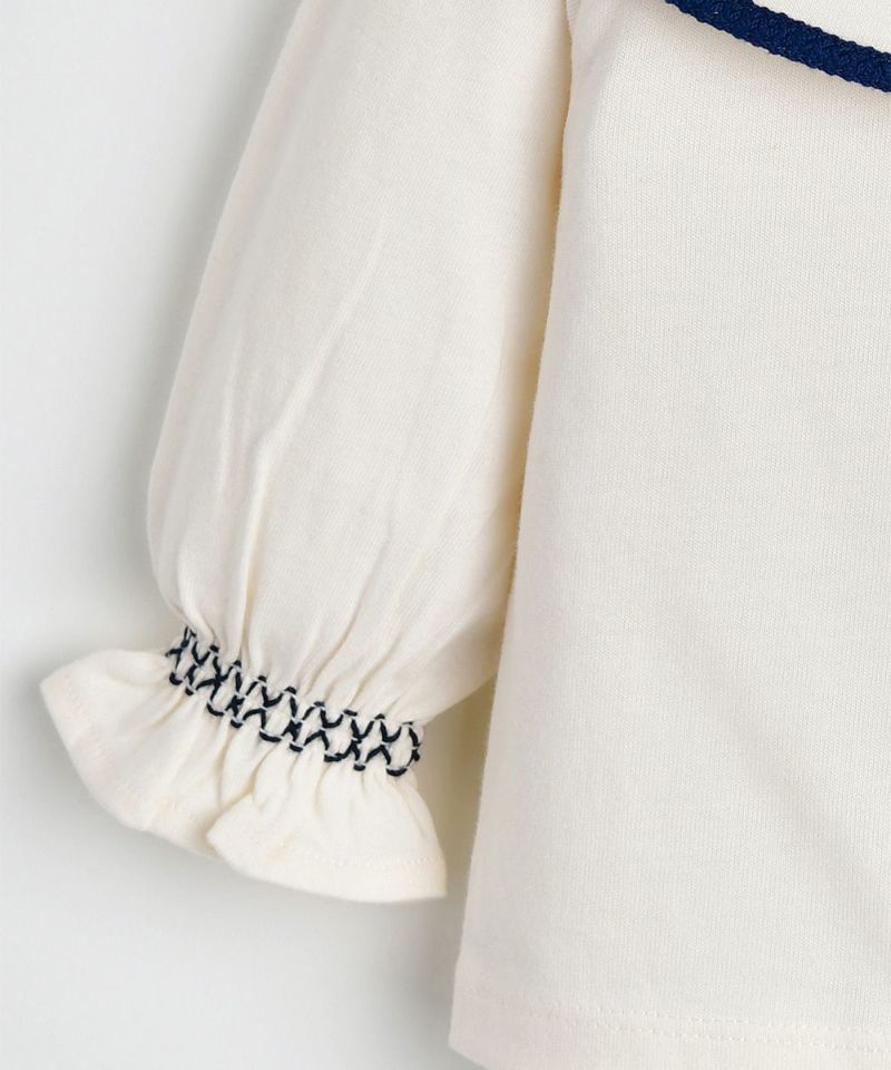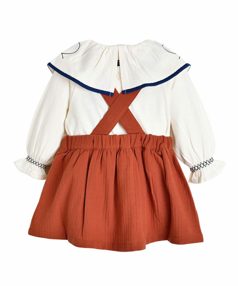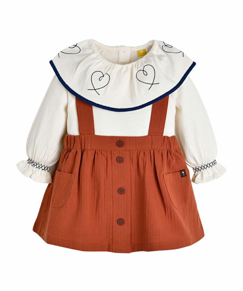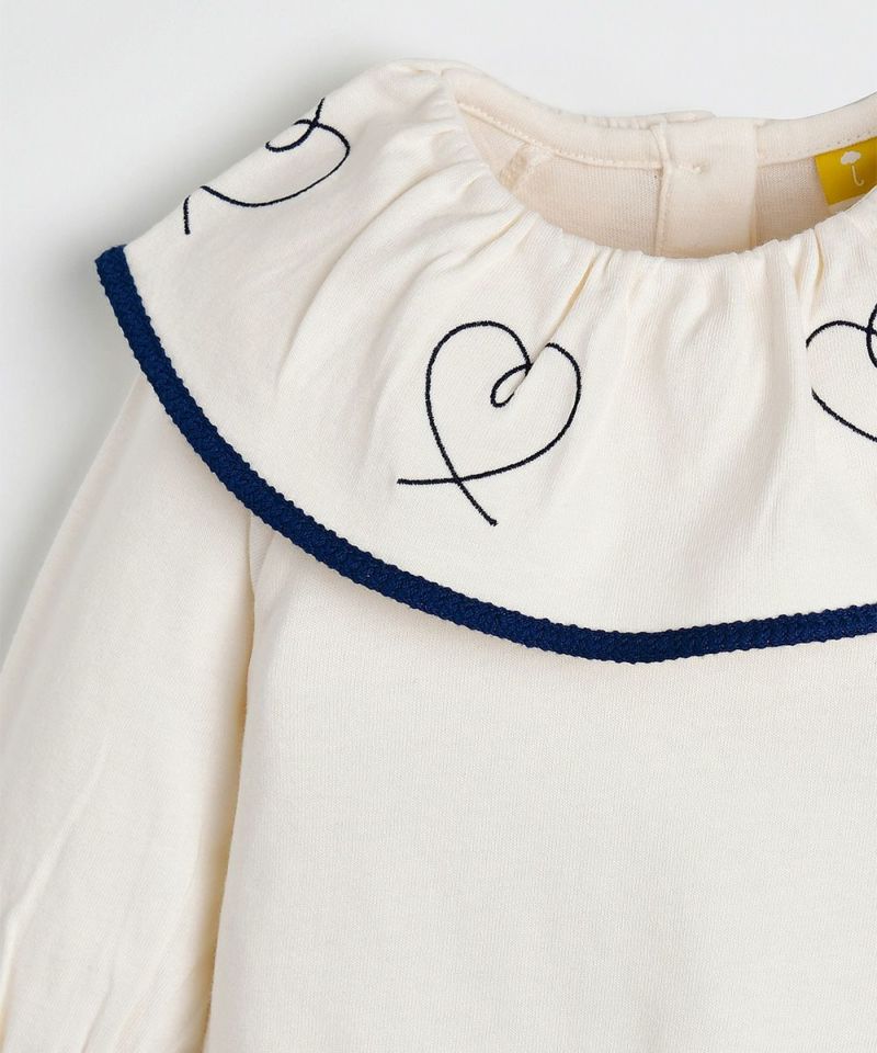 少し厚めのTシャツとプチポケットがポイントのオーバーオールスカートのセットアップ。ビッグフリルカラーのハート刺繍、袖のスモックがかわいいブラウスのようなTシャツがいとおしさをよりプラスしてくれるアイテムです。