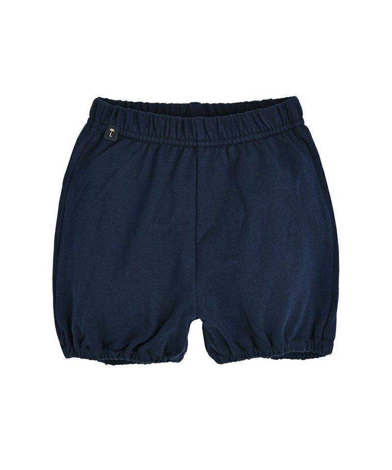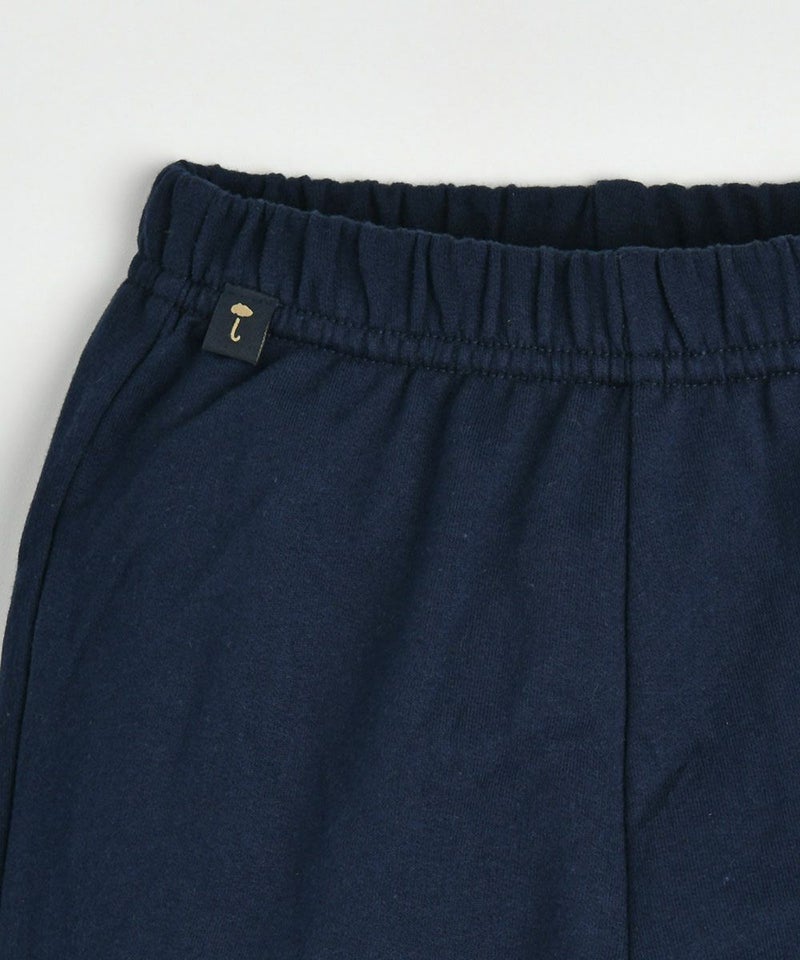ユニークなブルーフラワープリントのブルマセットアップ。ネックラインのバイカラーがポイントです。