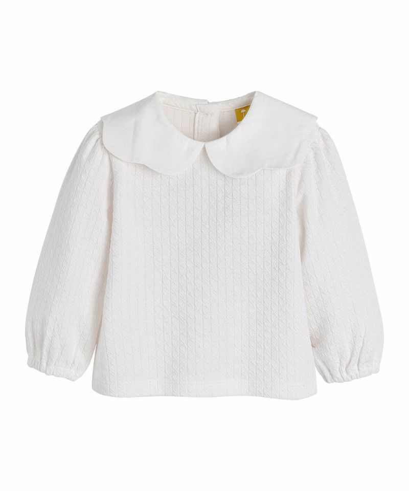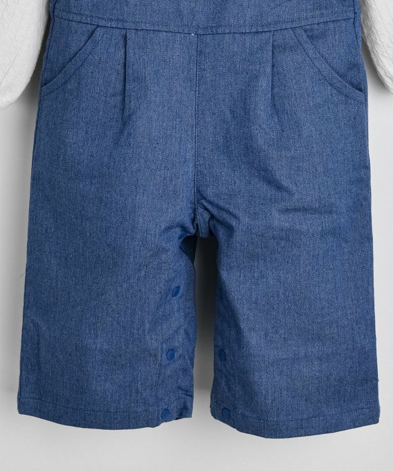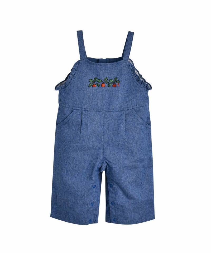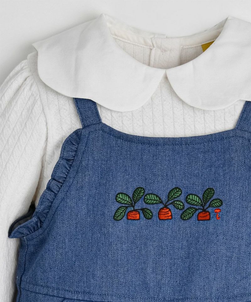 ジャカードリブ素材を使ったTシャツとデニムのオーバーオールのセットアップ。ユニークな襟の形とキャロットの刺繍がポイントです。