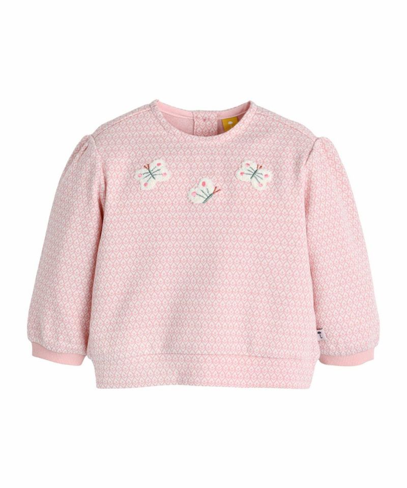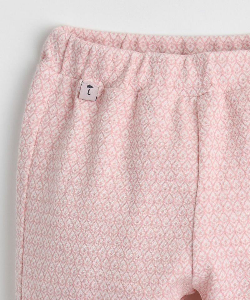 クローバーパターンのジャカードセットアップ。トップスの胸元に立体感のある小鳥と蝶の刺繍で春の感じを加え、ボトムの裾をストレッチバンディングにすることで、着用が快適で登園ルックに着やすいアイテムです。