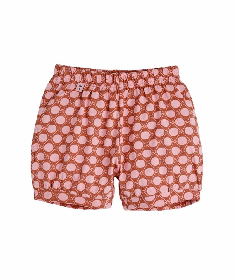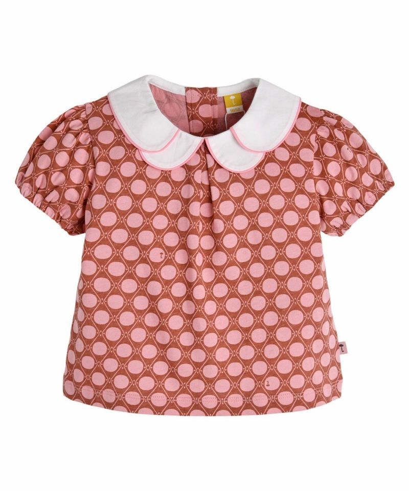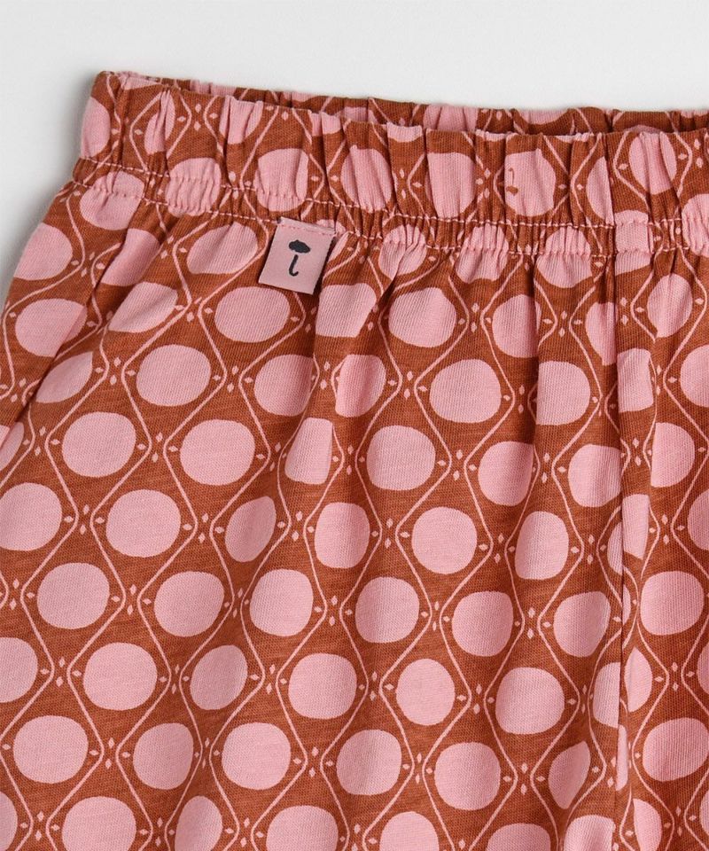 リピートされた丸のパターンがレトロなムードを醸し出す半袖セットアップ。二重襟のピンク配色がラブリーなアイテム。同じシリーズの男の子用セットアップ(M252STB04P)と兄妹ルックがおすすめです。