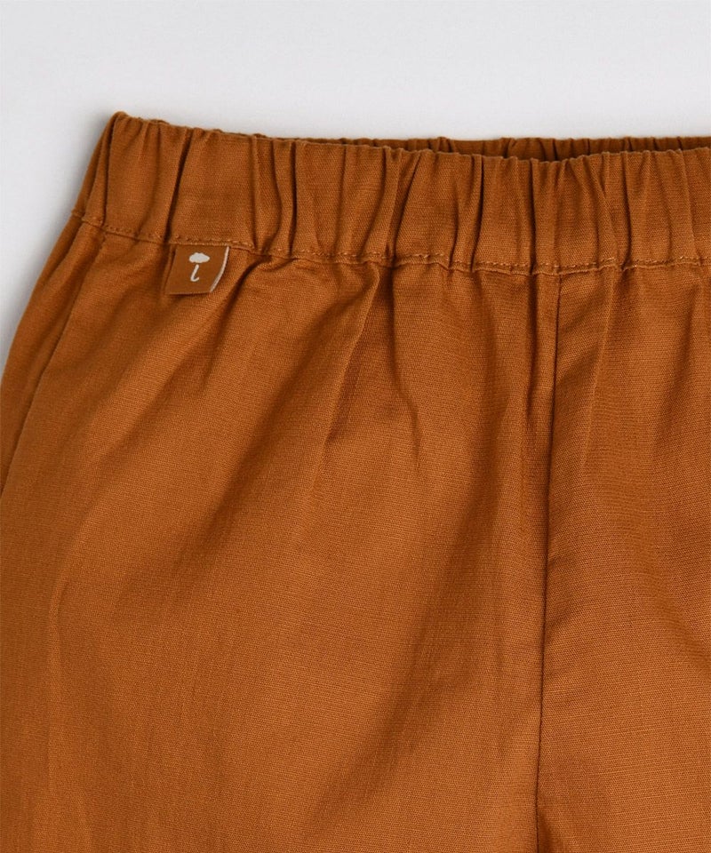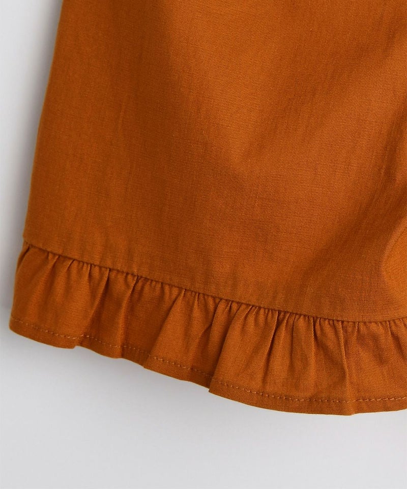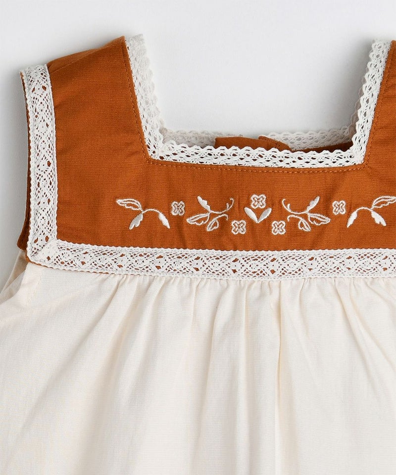 アイボリーとキャメルの組み合わせがビンテージなムードのキャミソールセットアップ。リネン素材を使用しているため通気性がよく快適に着用でき、リネン特有のナチュラルなムードがおしゃれなアイテム。スクエアネックに沿って入ったフラワー刺繍がムードをアップさせAラインのトップスとパンツ裏のフリルが女性らしさをプラスし、楽に着用できるアイテム。