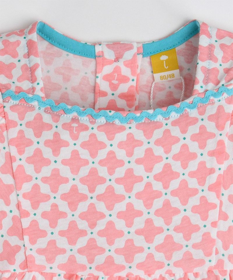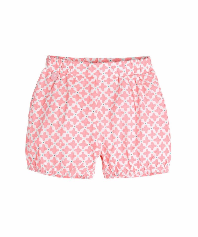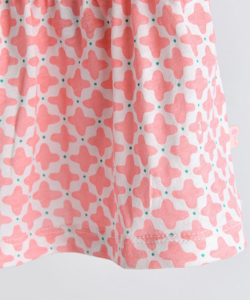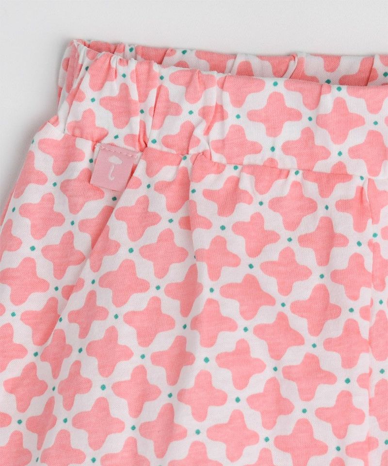 華やかなピンクカラーの幾何学図形総柄でデザインされたレトロなムードの半袖セットアップ。スクエアネックとシャーリングをした肩でユニークなシルエットを演出しミントカラー配色ラインがラブリー。エンザイム加工により着心地がさらに柔らかく洗濯後も変形が少ないアイテム。
