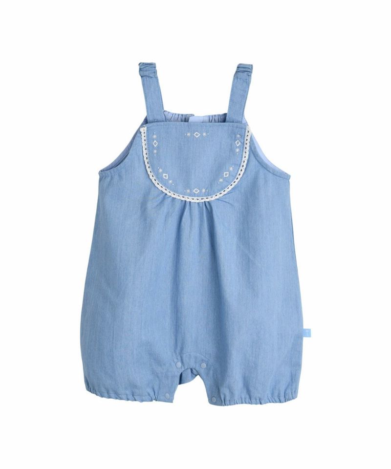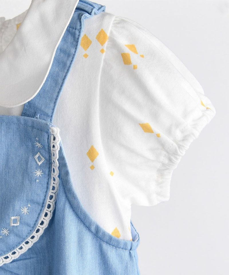 可愛いカラーのダイヤ型がプリントされたTシャツと涼しいカラーのオーバーオールがセットになったセットアップ。柔らかく伸縮性に優れた素材で、丸い襟がかわいく、オーバーオールの胸の上部分にレースの飾りとユニークなダイヤモチーフの刺繍でポイントを与えたカジュアルなデザイン。エンザイム加工により着心地がさらに柔らかく洗濯後も変形が少ないアイテムです。