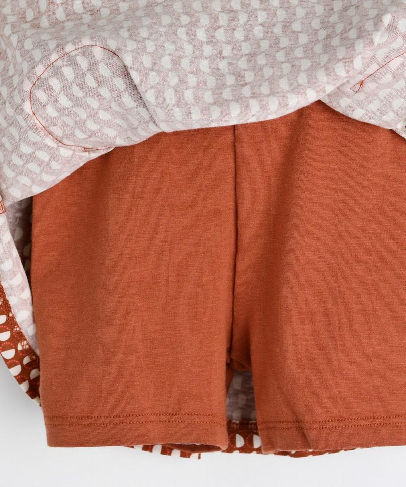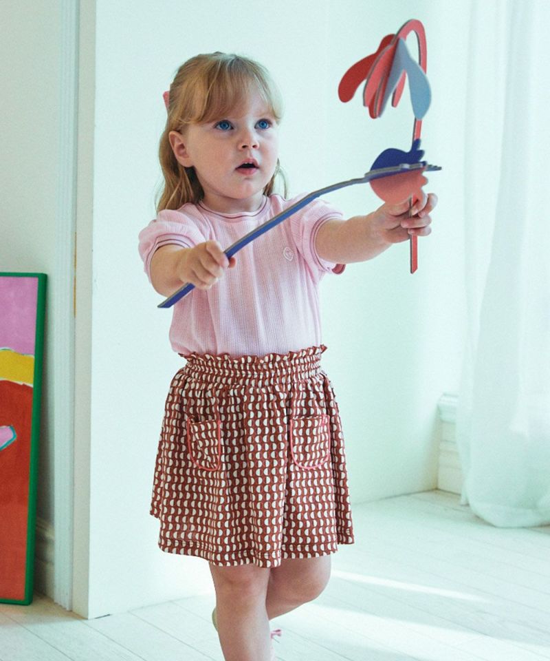 ムードのあるブリックカラー感の幾何学グラフィックがユニークなスカートとトップスのセットアップ。軽くて柔らかい素材にネックと袖の絞りでポイントを与えたラブリーなムードを演出しやすいアイテム。エンザイム加工により着心地がさらに柔らかく洗濯後も変形が少ないアイテム。