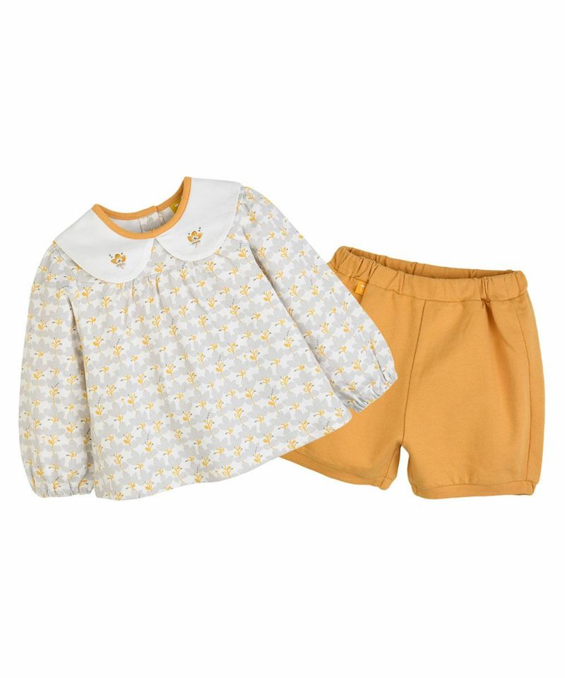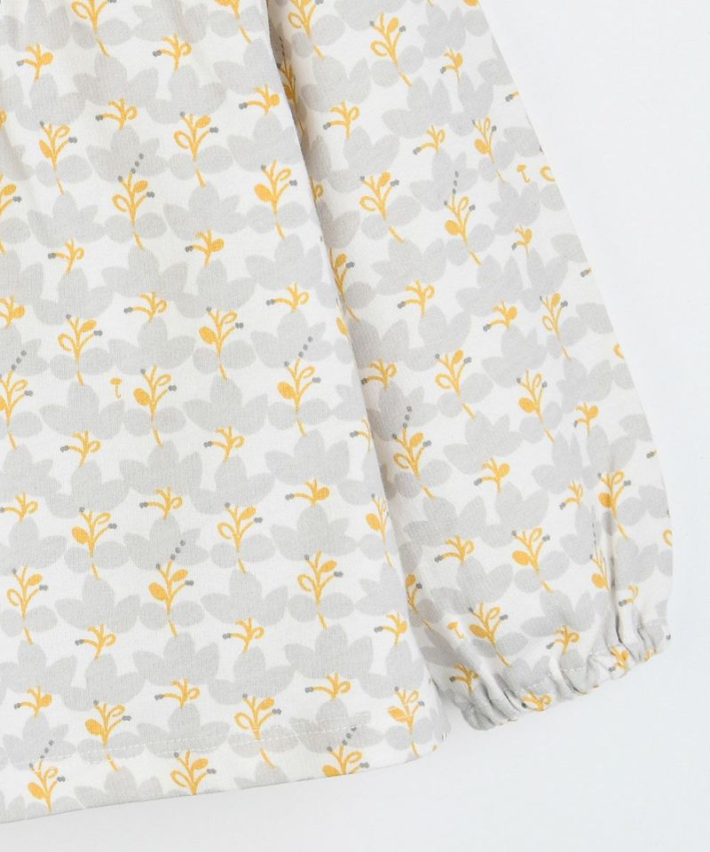 モイモルンらしいフラワー総柄のガーリーなトップスと、かわいいブルマパンツがセットになったアイテム。袖口はゴム入りでフィット感あり、背中にはボタン付きで脱着も簡単。グレーとマスタードの調和が落ち着いた雰囲気で、かわいい丸襟とアクセントに花刺繍でラブリーに仕上げています。カバーオールセット(M253ROB05P)と姉妹ルックがおすすめです。※ポケット無し