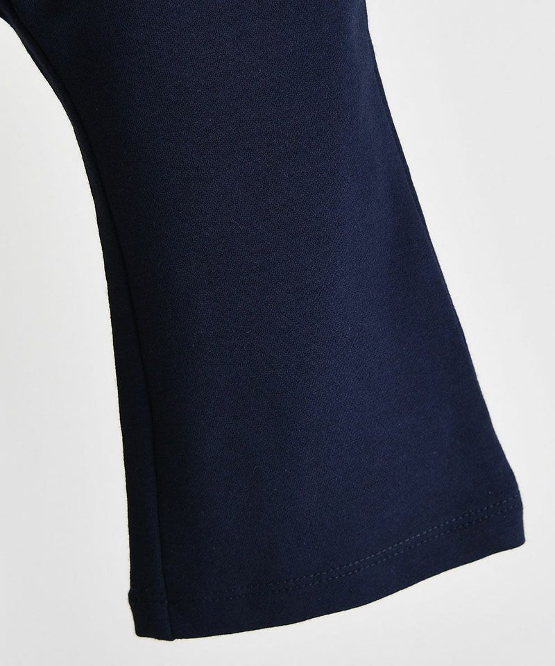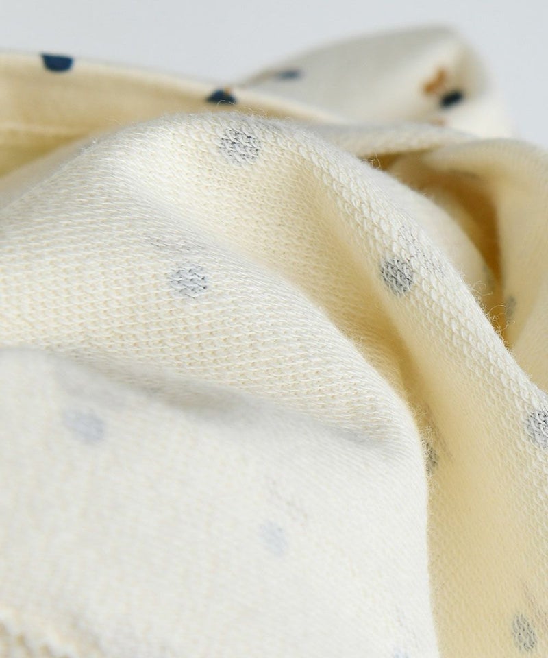 ブルーベリー柄のゆったりしたAラインシルエットのトップスと伸縮性に優れたブーツカットのロングパンツのセット。襟のスカラップフリルの先に刺繍や首回りのパイピングでネイビー配色を施し、後ろの首元にはボタン付きで脱着も簡単。カバーオールセット(M253ROB06P)、男の子用セットアップ(M253STB02P)と姉妹ルック、兄妹ルックとしておすすめです。※ポケット無し