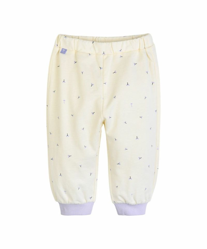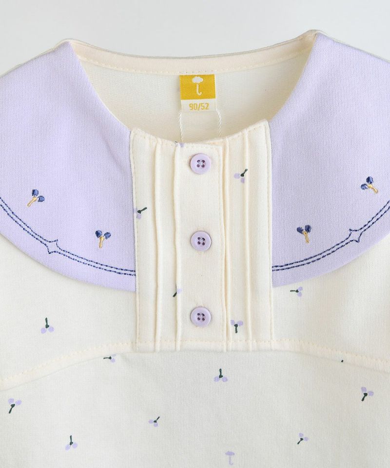 moimolnのシードカラーのラベンダーとかわいい新芽の総柄がポイントの長袖トップスとロングパンツのセット。大きな丸襟の新芽刺繍とステッチで、おしゃれ感が増しています。袖口と裾はリブを使用、フロントのボタンで脱着も簡単。登園ルックやお出かけルックとしてぴったりなデザインです。※ポケット無し