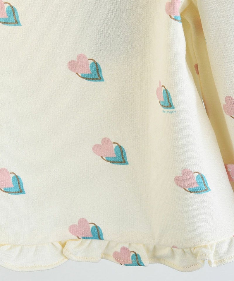 裾に短いフリルでAラインのシルエットをさらに活かしてバギーフィットパンツで快適に着用できるアイテム愛らしいムードのハート全面プリントの長袖トップスとロングパンツのセット。トップスは、襟や裾のフリルがラブリーで、カラーバランスの取れたワントーンのロングパンツはすっきりとしたシンプル設計。冬のデイリールックはもちろん、おでかけにもおすすめのアイテムです。