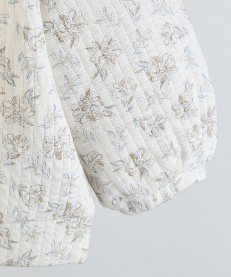 キルティング素材に花柄を全体にプリントした長袖トップスとレギンス付きショートパンツのセット。トップスはネックの大きなフリルにグレーのパイピングで配色をプラス、袖口を裾にはゴムにより絞りが加えています。パンツは暖かみにある厚めのレギンスとショートパンツがセットになった仕様でお子さまの脱着も楽、元気に動き回れます。※開閉のためのボタンが付いています。