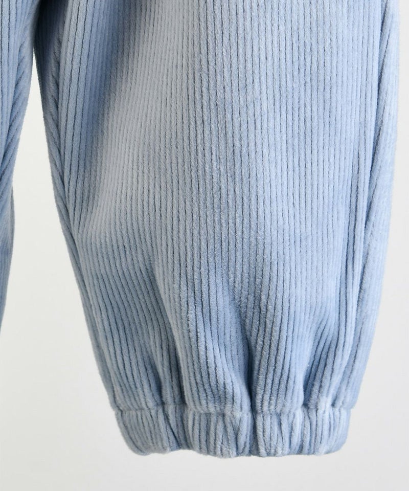 フロントの可愛いネコのミャオ(meow)刺繍がポイントの長袖トップスとロングパンツのセット。長袖トップスはネコ以外に木々もプラスされ、コーデュロイ生地が季節感にぴったり、襟は編み上げレースのようで異素材MIX感がおしゃれポイント。ボトムスはカラーコーデュロイのロングパンツで、セットアップとして以外にも、他のアイテムとのコーデの相性もばっちりです