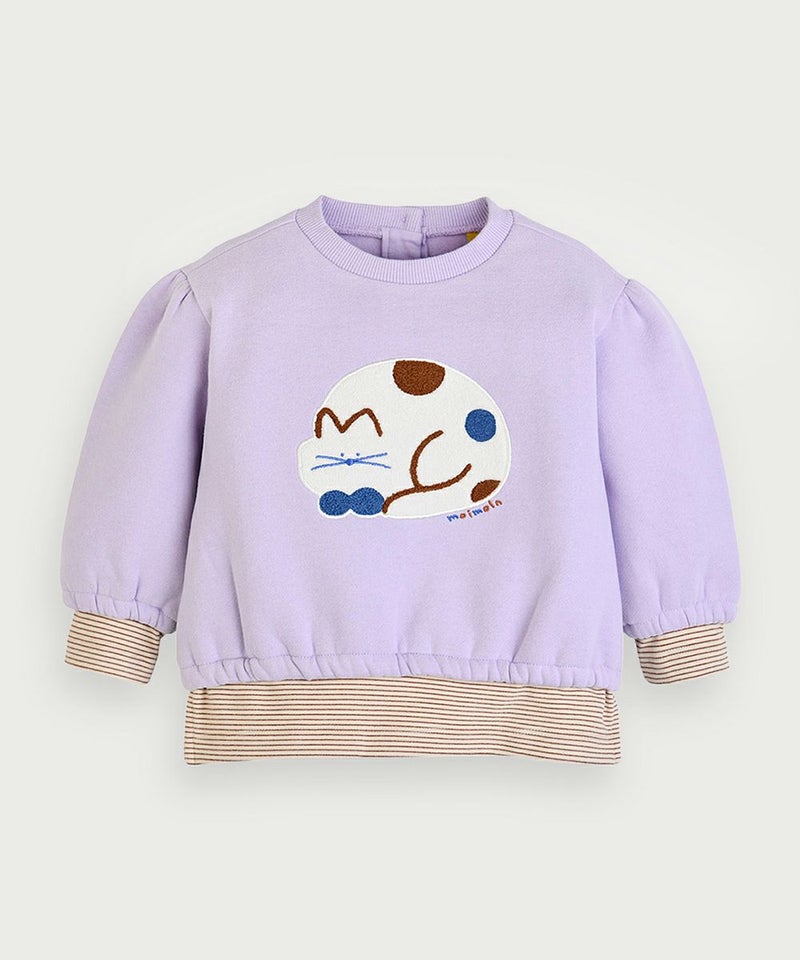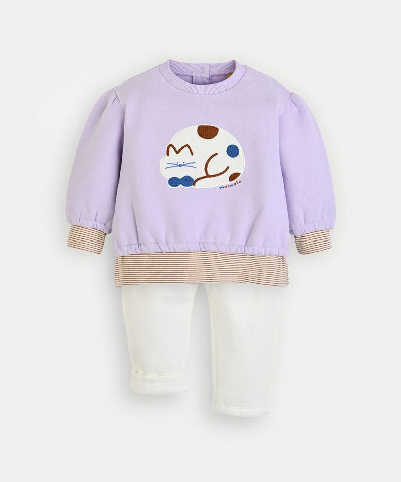 フロントの可愛いネコのミャオ(meow)のブクレ刺繍がポイントの長袖トップスとロングパンツのセット。長袖トップスはボーダーのインナーとレイヤーしたようなデザインがポイントで、ロングパンツはワントーンのシンプルデザイン、どちらも裏起毛で暖かさのある商品です。セットアップとして以外にも、他のアイテムとのコーデの相性もばっちりです。