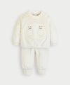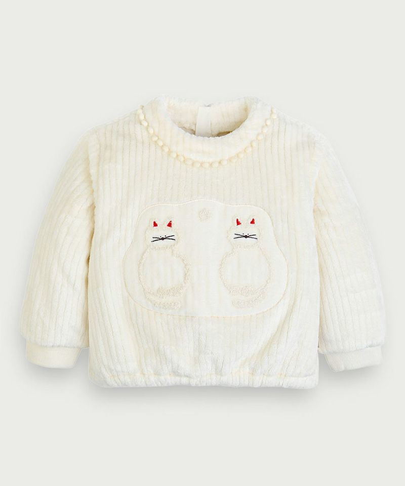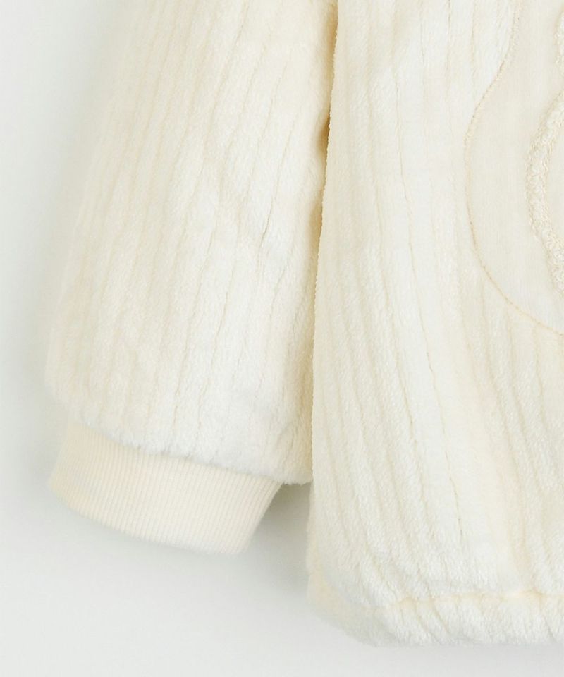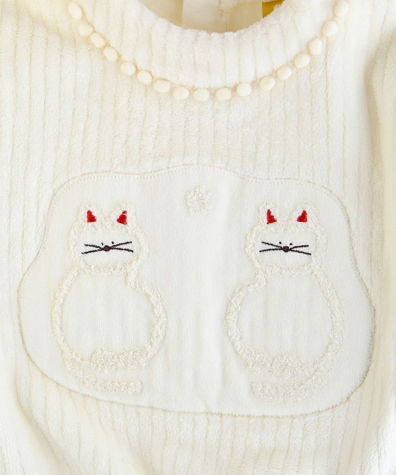 可愛いネコのミャオ(meow)刺繍がポイントのフリース素材の長袖トップスとロングパンツのセット。首元のポンポンやフロントのWキャットのミャオブクレ刺繍がポイント、パンツの幅のあるリブでおしゃれ度もアップ、冬にぴったりのモコモコアイテムです。※背中のファスナーで脱着も簡単、内側にファスナーガードを付け、肌への刺激を防止しています。