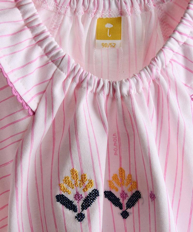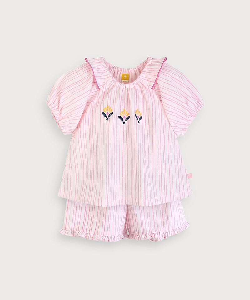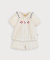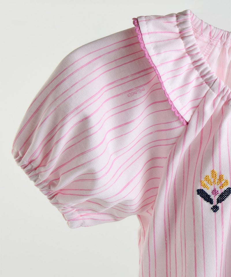 カラーによって違う色のベリー刺繍がポイントの半袖トップスとパンツのセット。