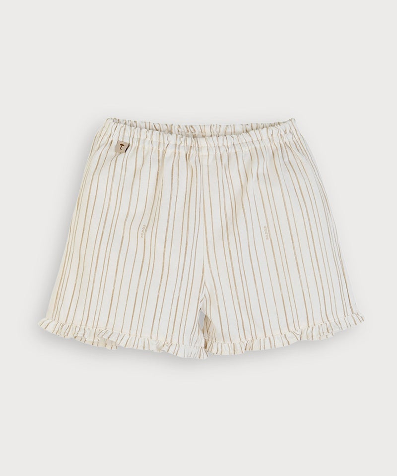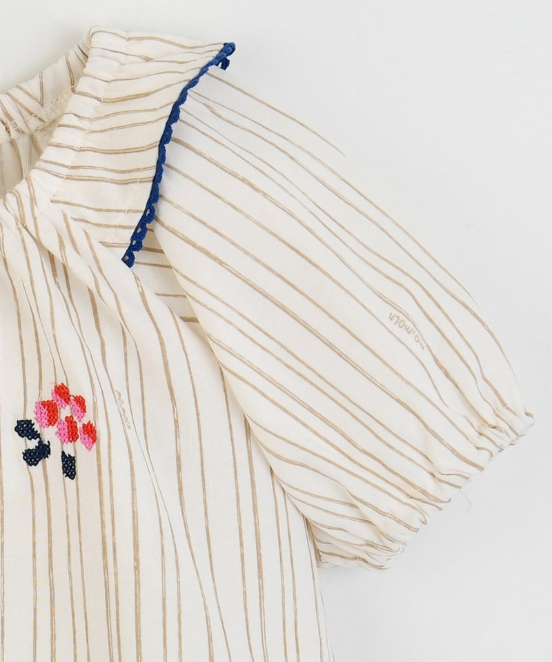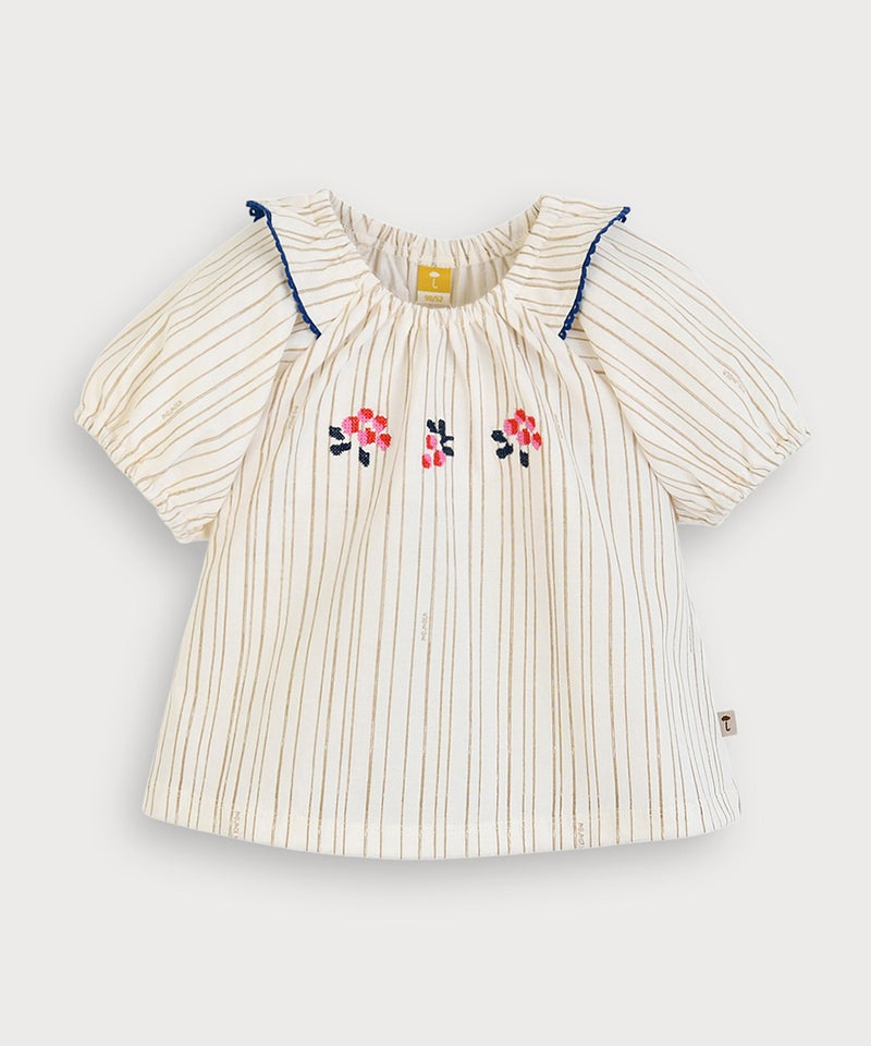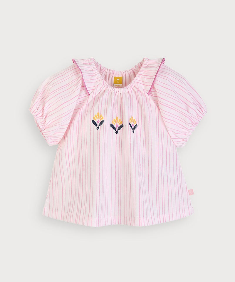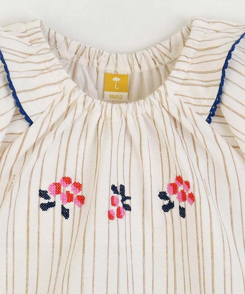 ふんわりとしたAラインのトップスにアームホールのフリル使いがアクセントに。