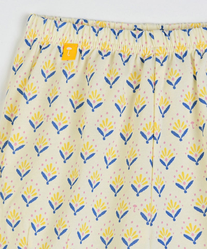 花火のようなイエローフラワーにピンクとブルーのカラープラスでパッとした半袖トップスとパンツのセット。