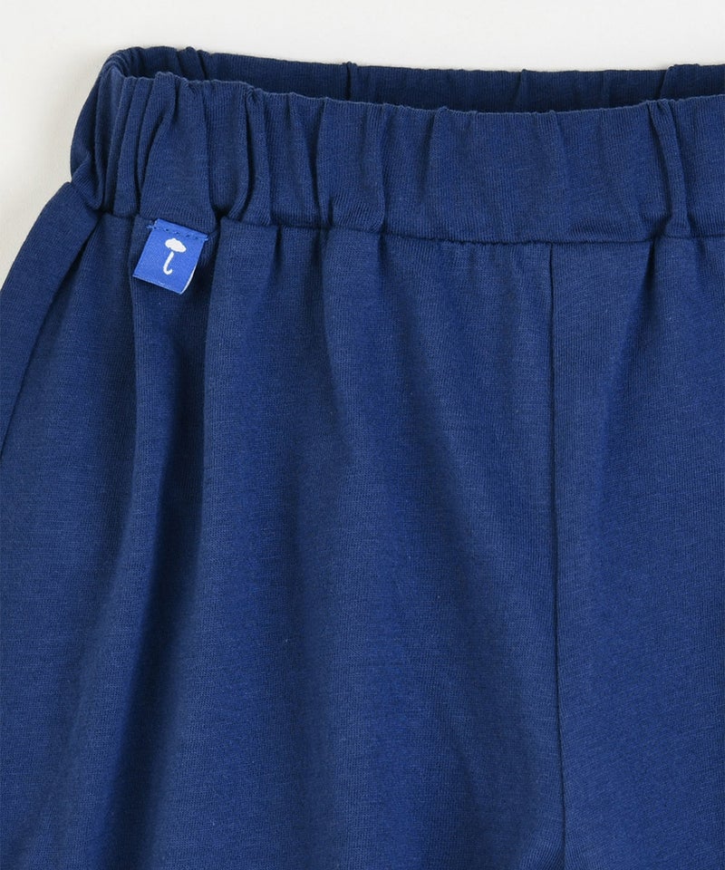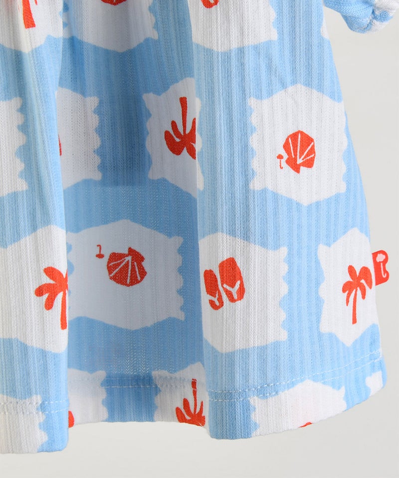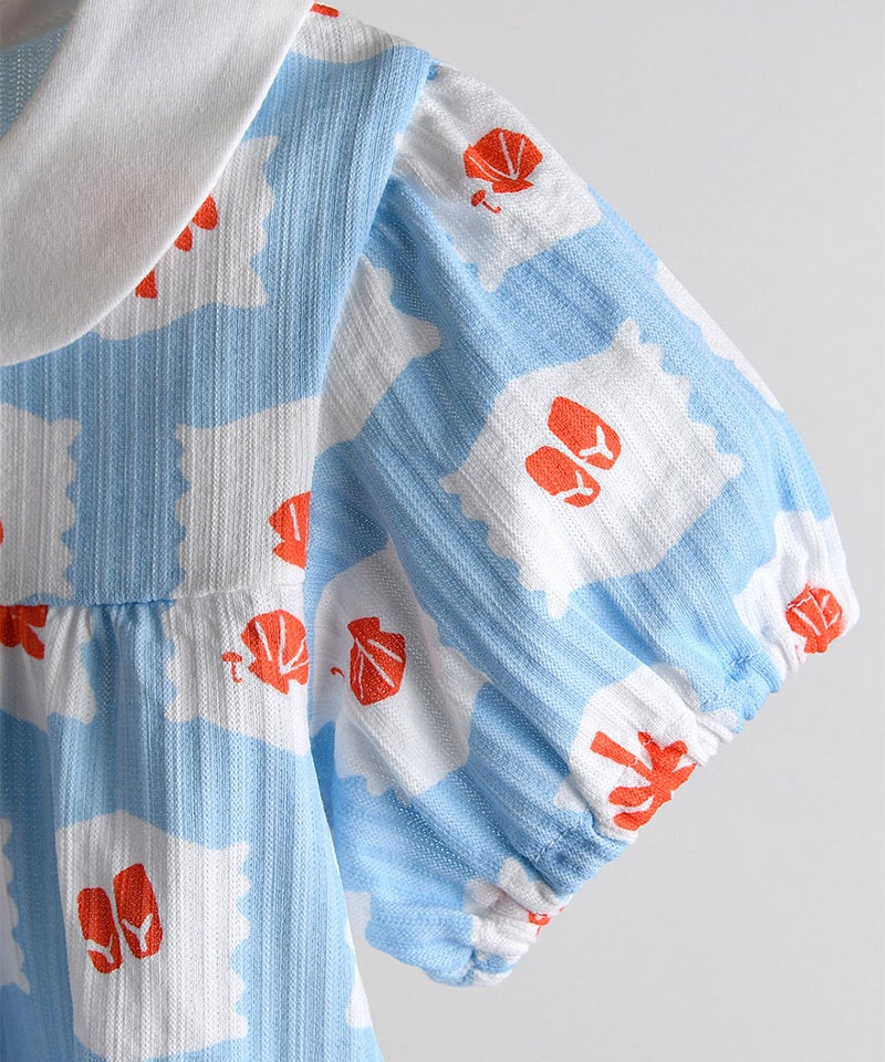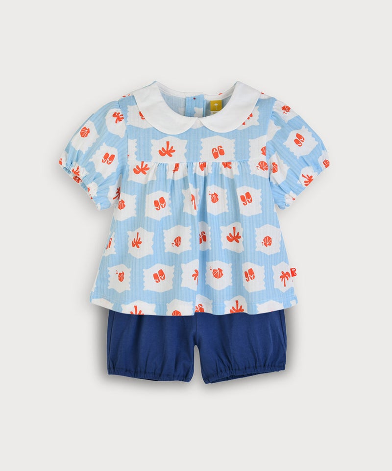 夏らしいアイテムたちがパッチのようにプリントされた丸い襟がかわいい半袖トップスとパンツのセット。