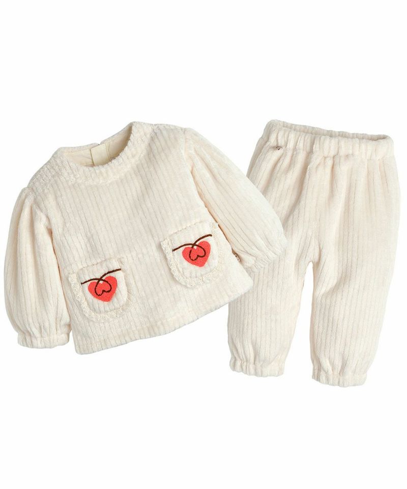 保温性に優れたソフトなフリース素材の花柄セットアップ。トップスのポケットのハート刺繍とレースがラブリーな印象を与え、通園コーデにも使えるアイテムです。