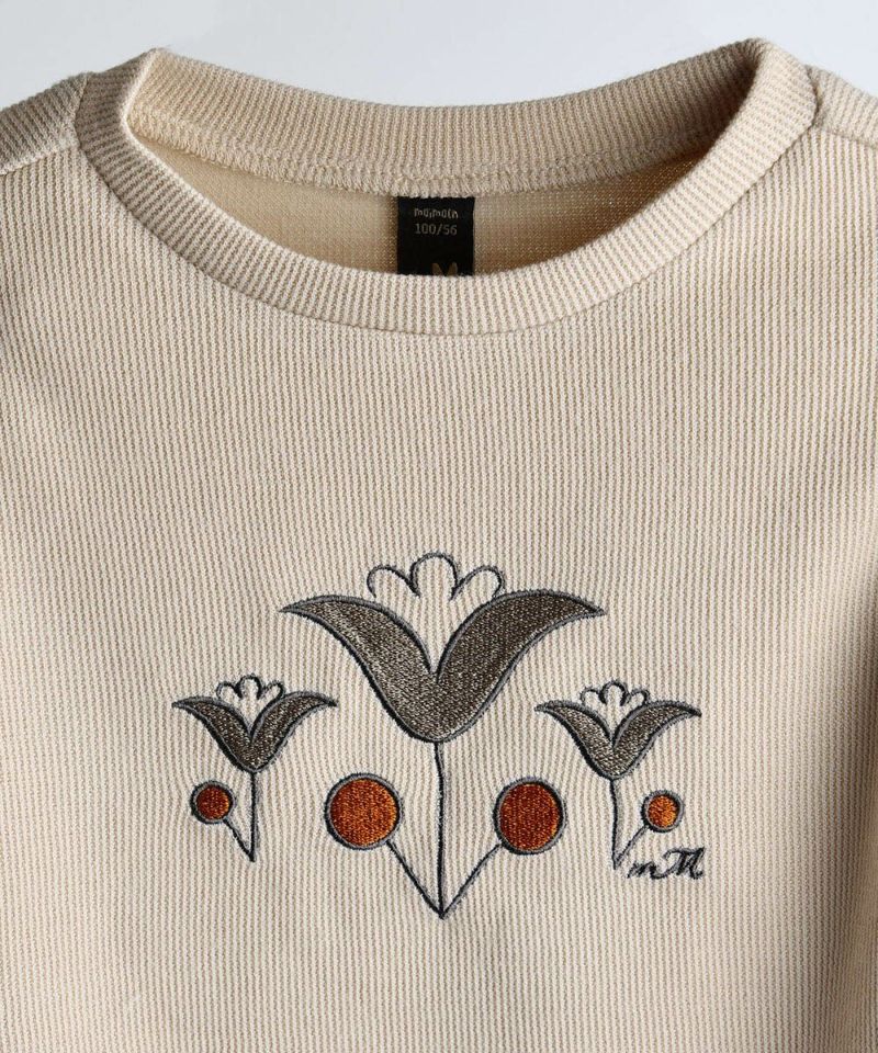 柔らかい素材のTシャツとジャカードスカートのセットアップ。オレンジカラーがポイントで、ベレー帽やロングソックスなどのアイテムで様々なコーデができるアイテムです。