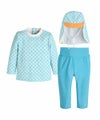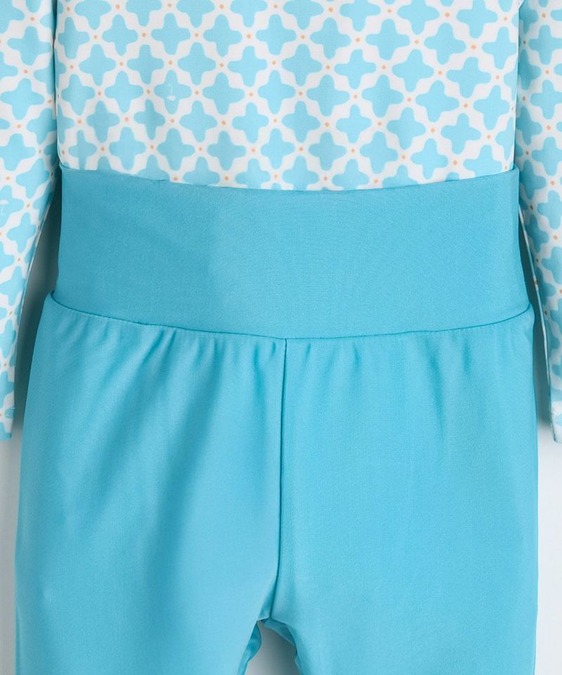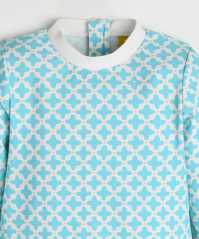 ユニークな図形グラフィックでレトロなムードのラッシュガード。お腹を楽にしてくれるレギンススタイルのパンツで水遊びの時も快適に活動できて、強い紫外線から肌を守り、日差しを遮る帽子が構成され肌焼けしないので実用的なアイテム