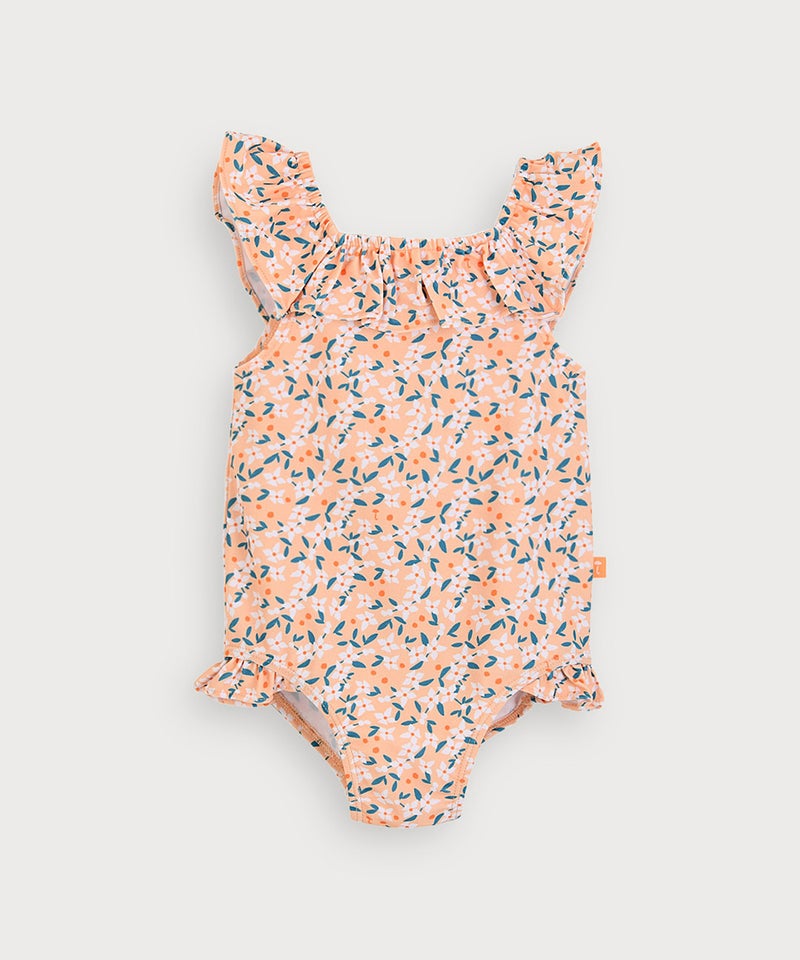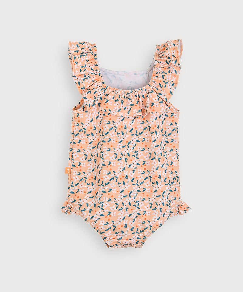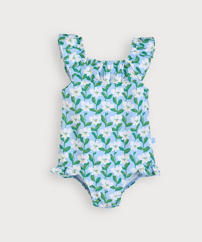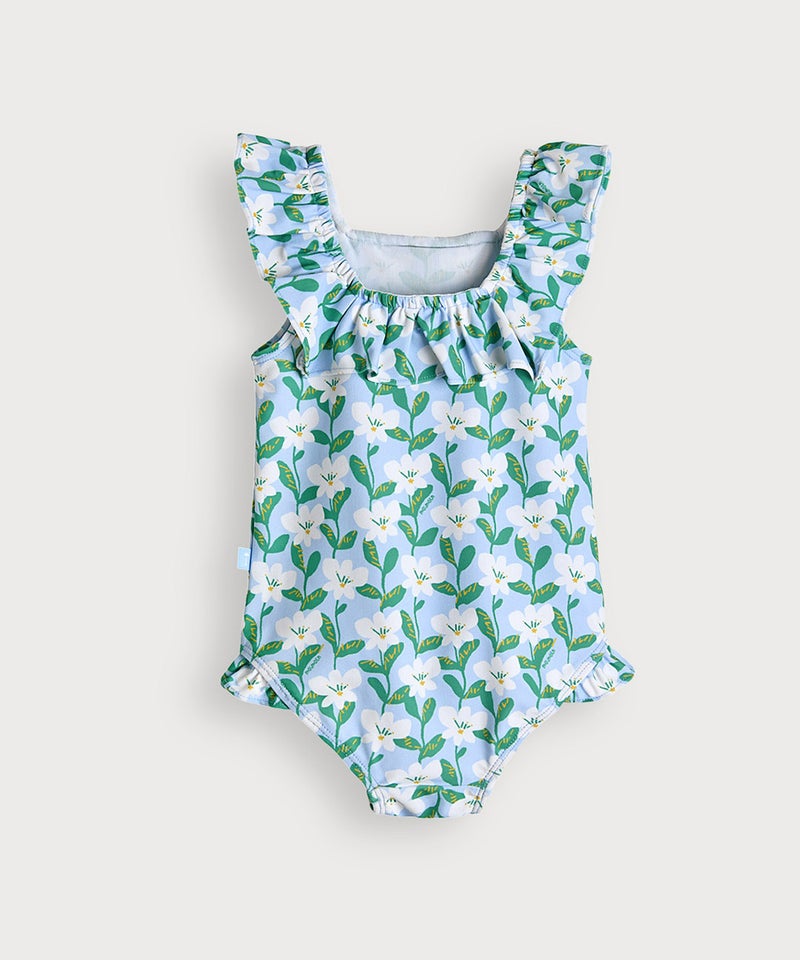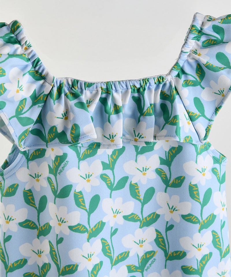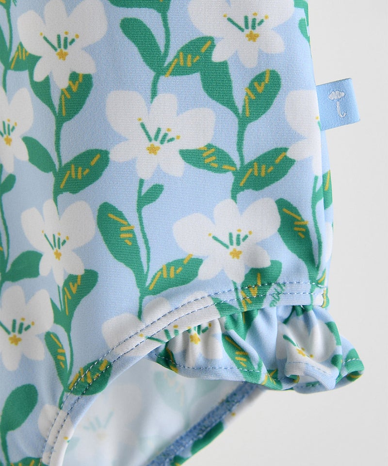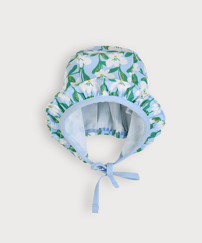 青々とした葉とジャスミンの花のような総柄プリントのワンピースタイプの水着と同柄同生地の帽子のセット。