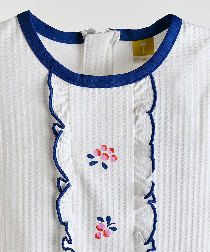 赤いベリー刺繍とフリル使いがCuteな半袖ラッシュガードとパンツ、帽子のセット。