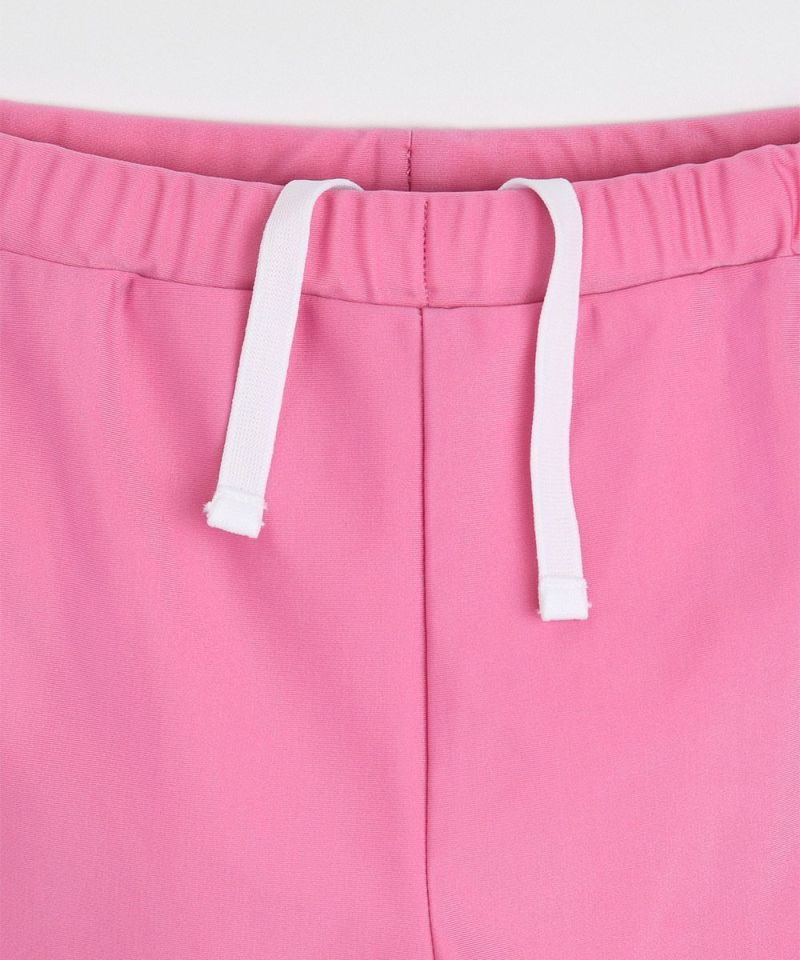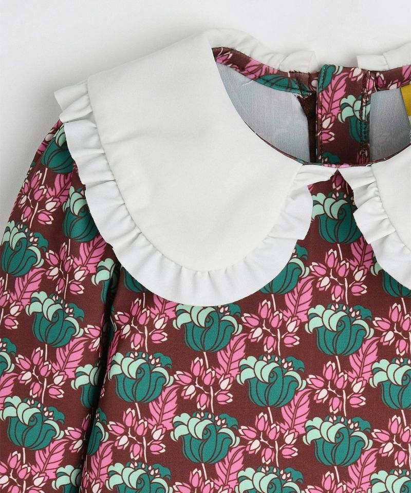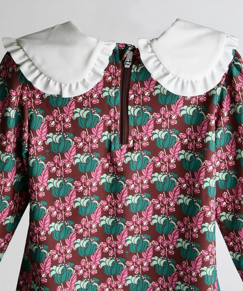 シーズンフラワー柄がユニークな女の子用ラッシュガード。大きな襟が可愛く、ハーフパンツスタイルのため着脱しやすいアイテムです。