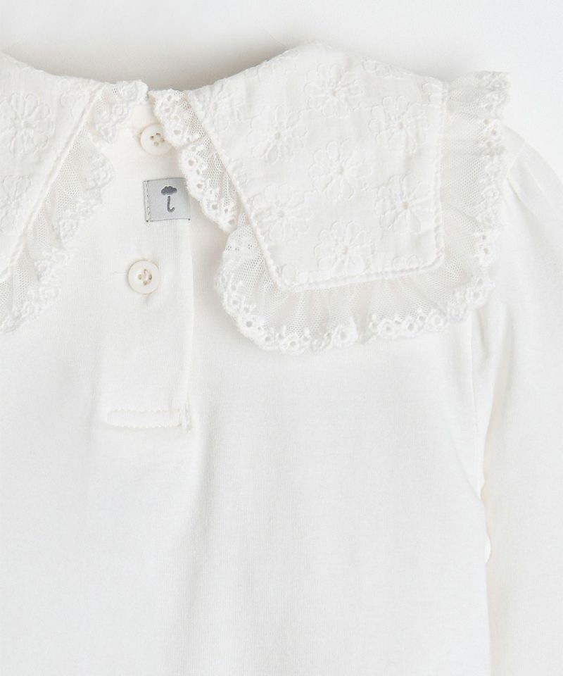 柔らかいモーダル素材の襟付きのTシャツ。立体的なフラワーの襟と襟の先のレースがかわいらしく、ベスト、パンツなど様々なコーディネートが楽しめるアイテムです。