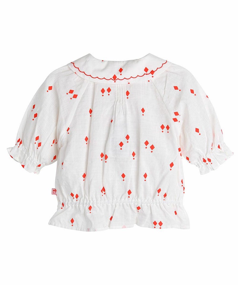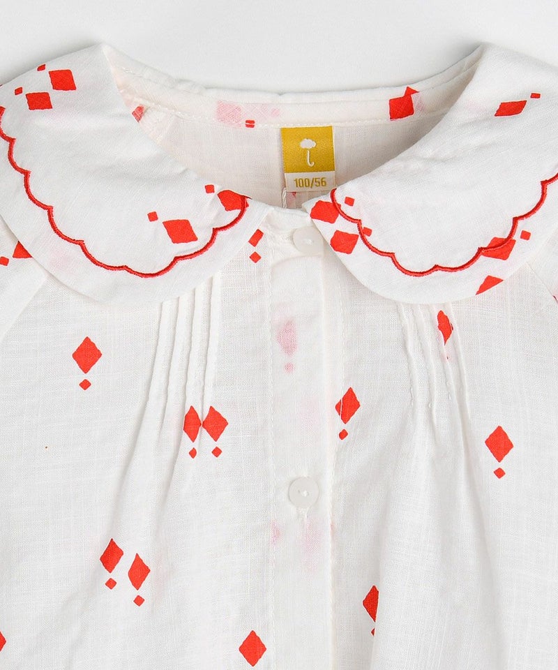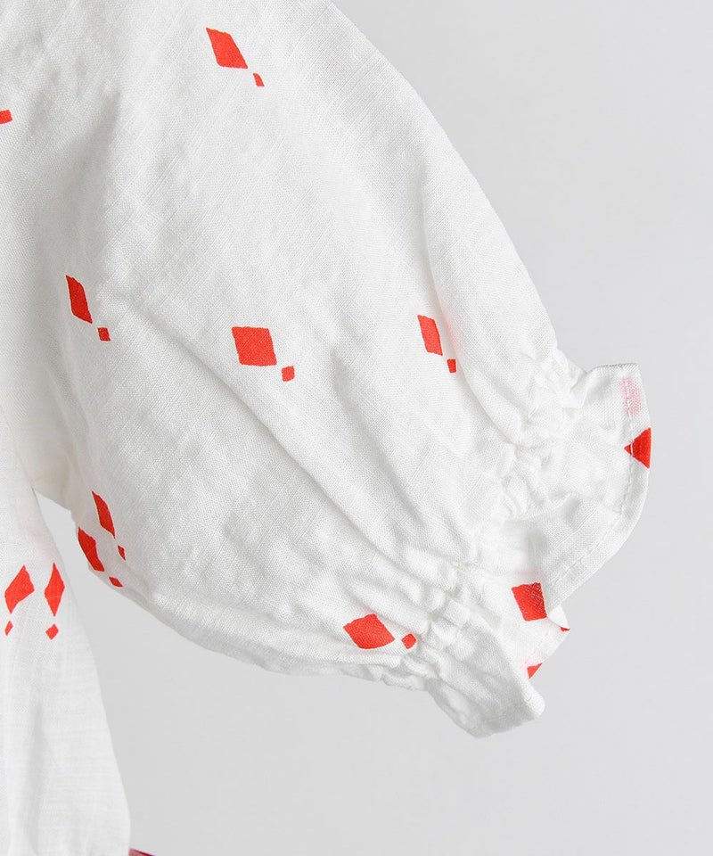 夏に着用しやすいさわやかな素材を使用した、涼しく着用できる7分袖ブラウス。襟部分の刺繍と腰のゴムひもで女の子らしさを強調しつつ端正さまで感じられるアイテム。袖と腰の部分にゴムひもが丸いフィット感を演出し、同じ柄のシャツ(M252SHG02P)と兄妹ルックが楽しめるアイテムです。