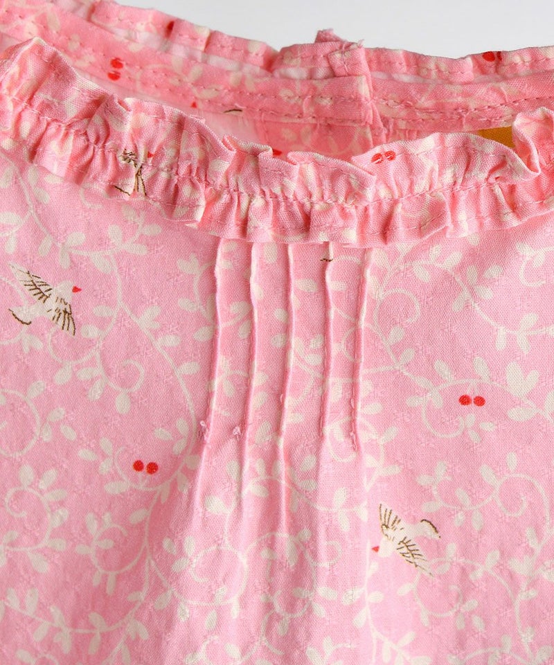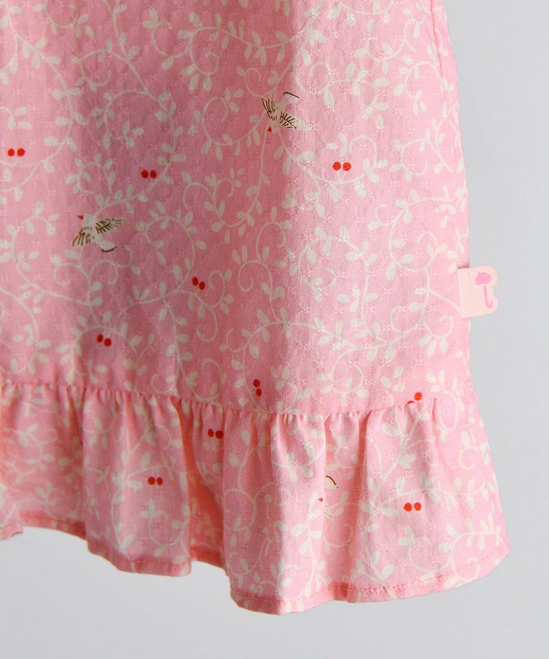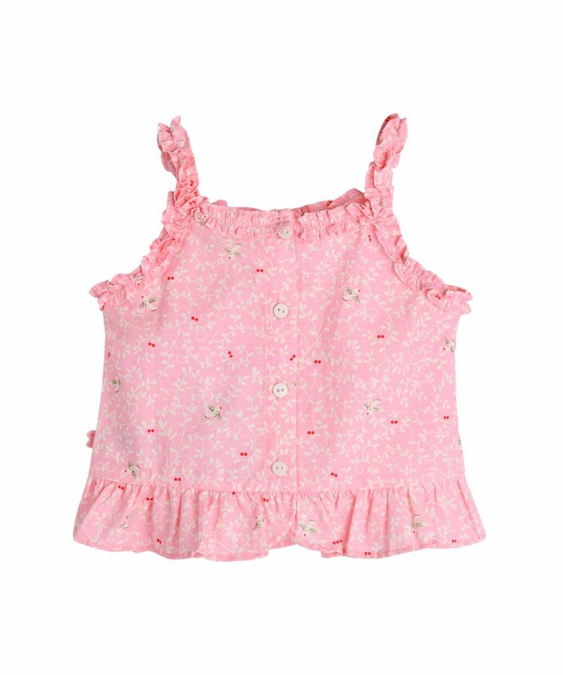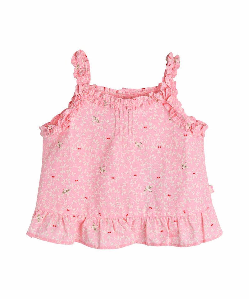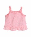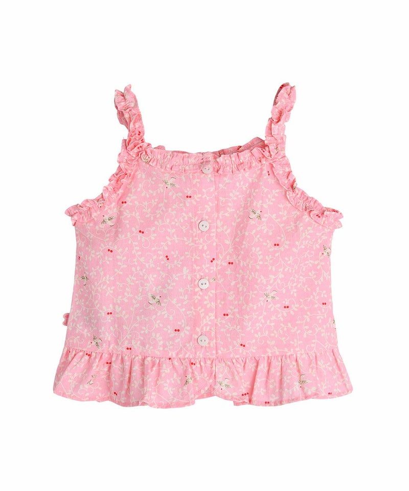 華やかなピンクのカラーにホワイトカラーを使用した穏やかな木の葉モチーフのノースリーブブラウス。高級感があり、愛らしいフリルのディテールと女の子らしいフィットで単体で着てもコーディネートのポイントとしても着用できるデザインです。