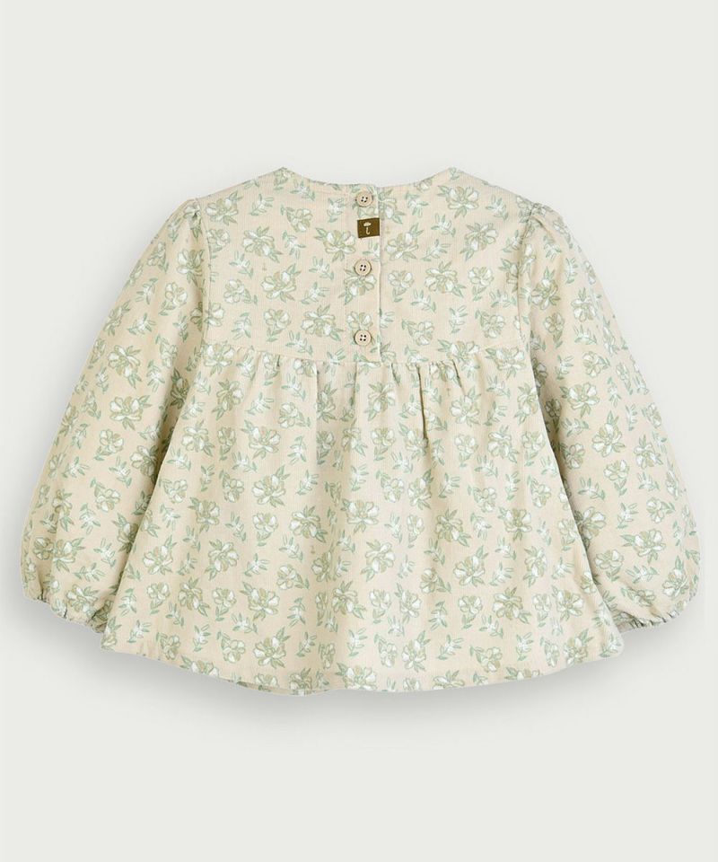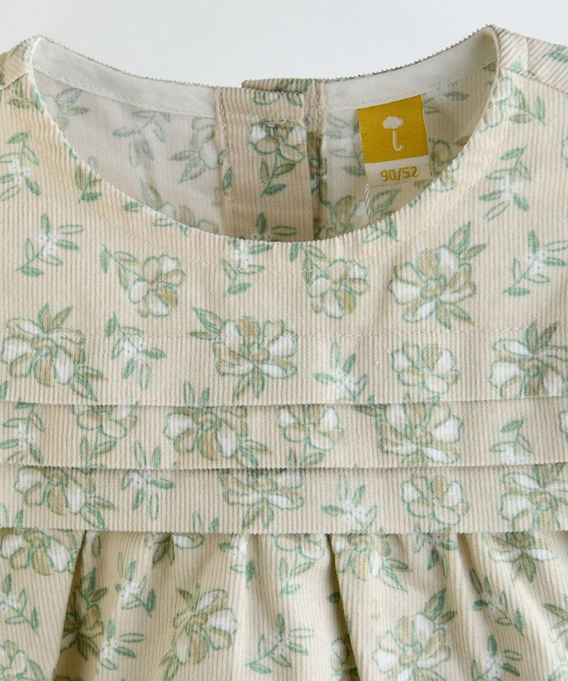 ベージュ×グリーンのフラワーパターンが愛らしいコーデュロイ素材の長袖ブラウス。胸元のピンタックのディテールが高級感あふれるシルエットを出し、裾のさりげないブランドロゴ刺繍でポイントを与えたアイテム。背中のボタンで脱着もスムーズ、少しAラインのデザインがより女の子らしい雰囲気を出してくれます。