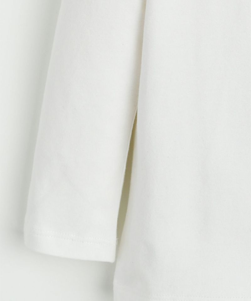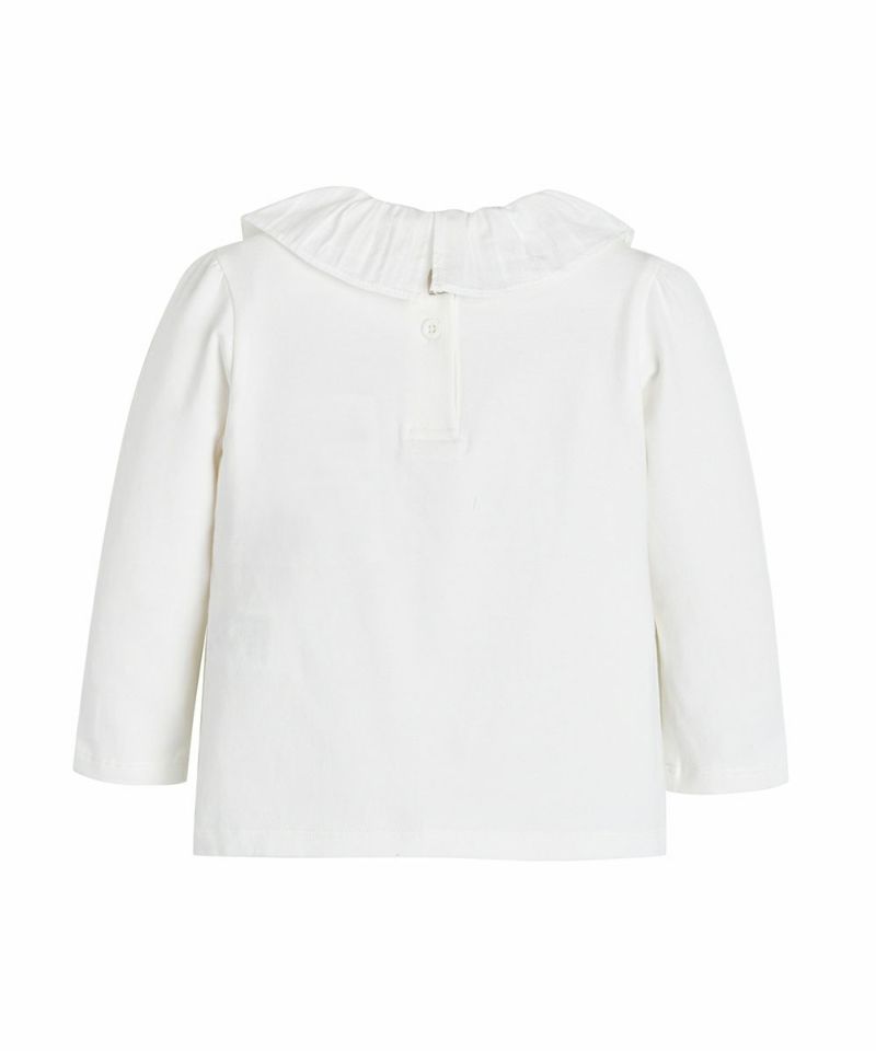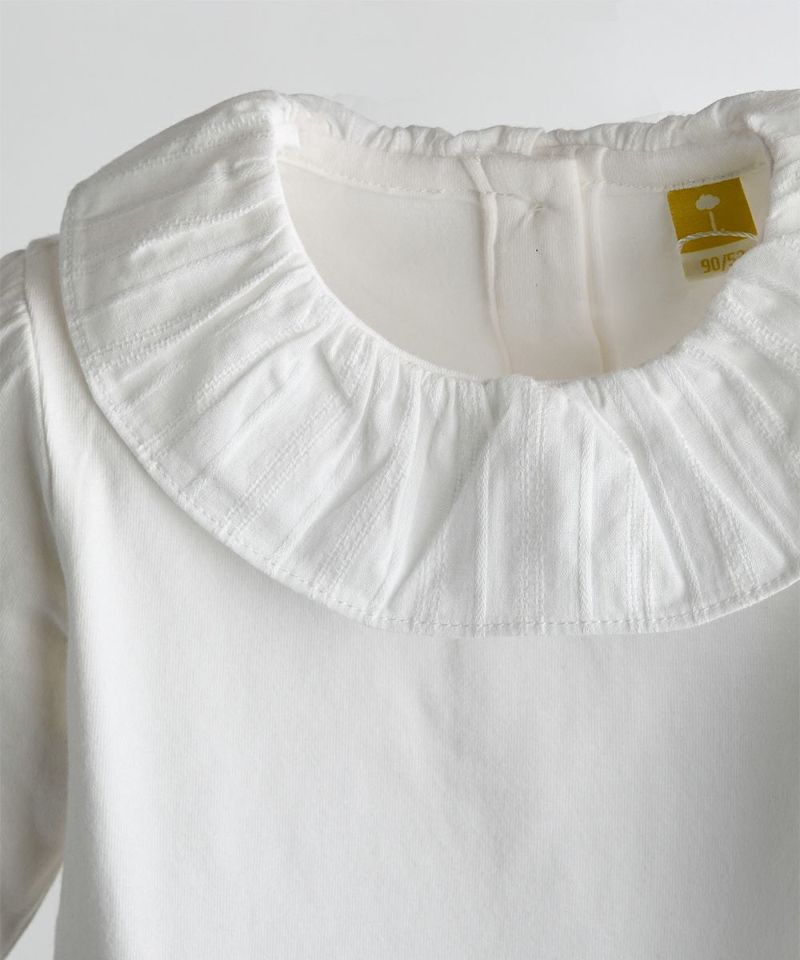 落ち着いたフリルの襟と袖のシャーリングがポイントの女の子らしいTシャツ。ベーシックなアイテムとしてオーバーオールやワンピースにインナーとして着たり、単品でも活用性の高いアイテムです。