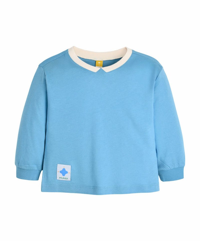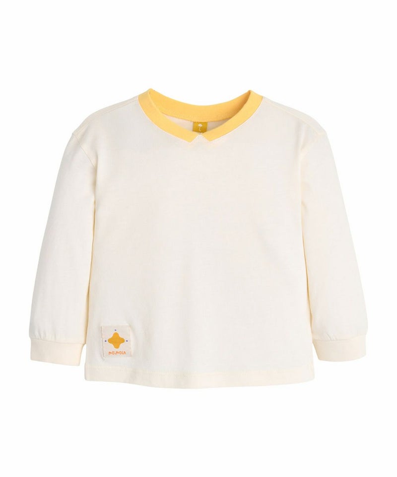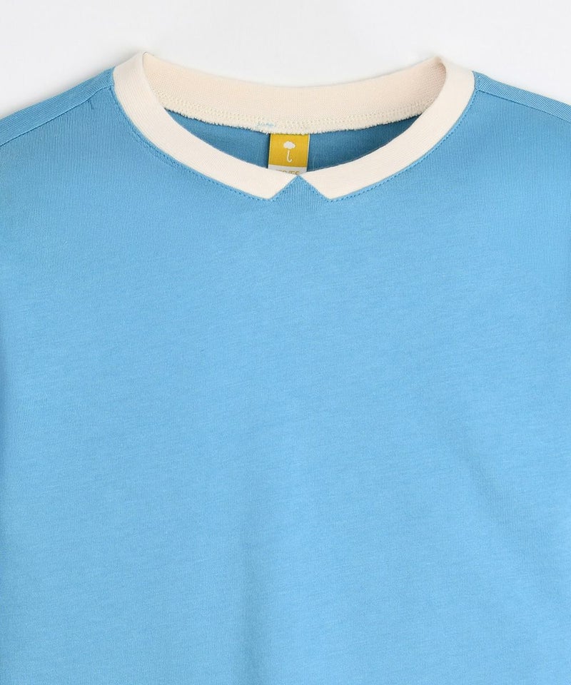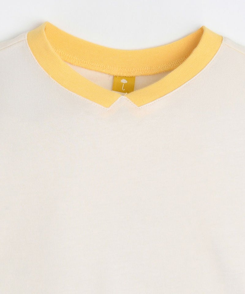 ユニークなネックラインのディテールに可愛い図形ラベルがポイントのTシャツ。柔らかくてさらさらする薄いモーダル素材で着心地がとても良くて春から初夏まで着やすいアイテムです。