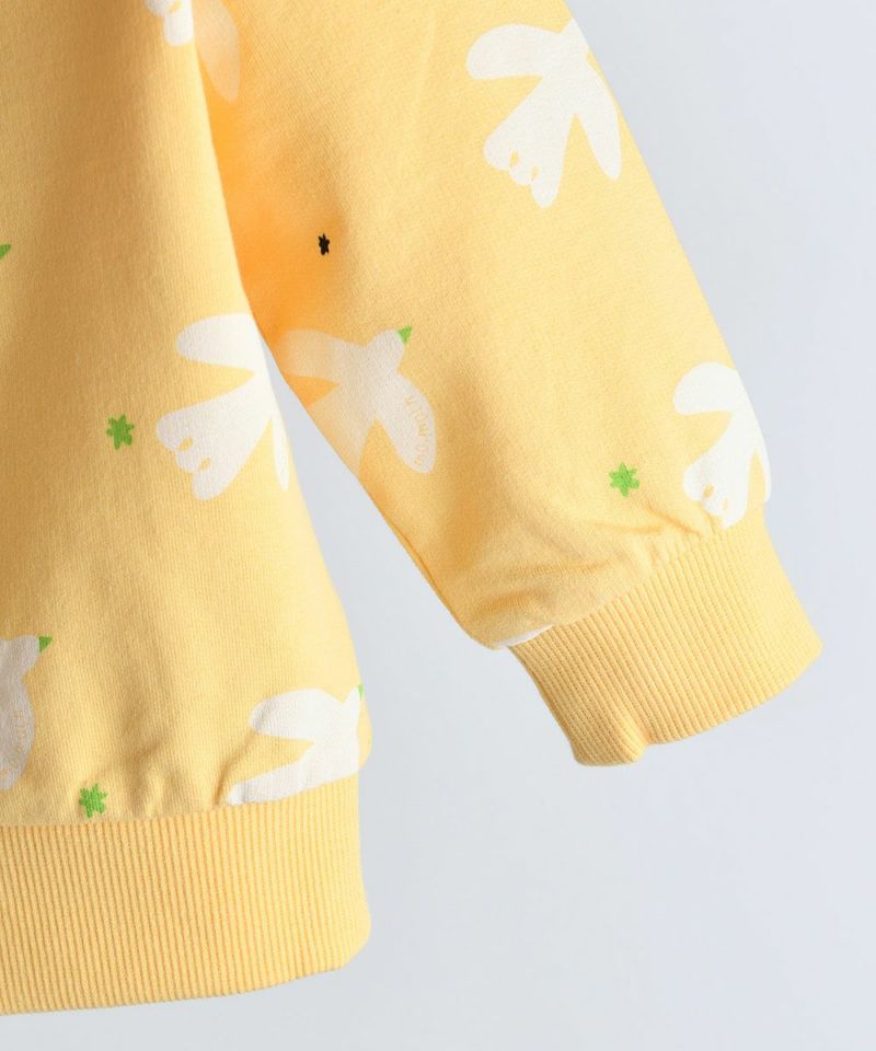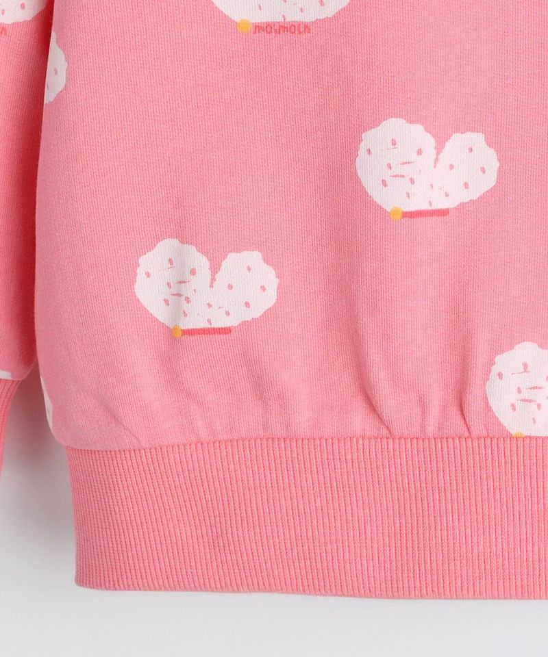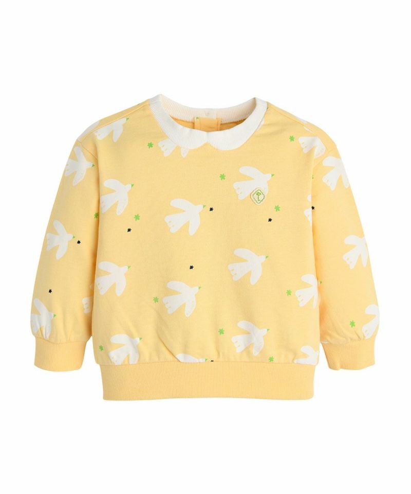 春を告げるさわやかなカラー感の蝶と鳩のスウェットシャツ。ネックラインの襟型配色ディテールがポイントで、軽くて薄い素材なので、春の登園ルックにオススメのアイテムです。